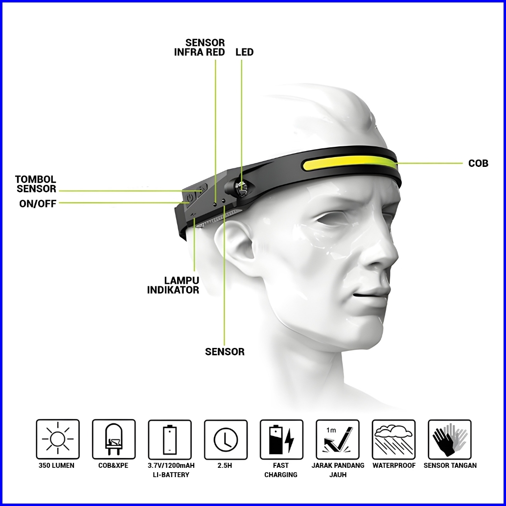 Suksestech Lampu Cas Headlamp Senter Kepala Sensor Tangan Yt-200 4 Mode
