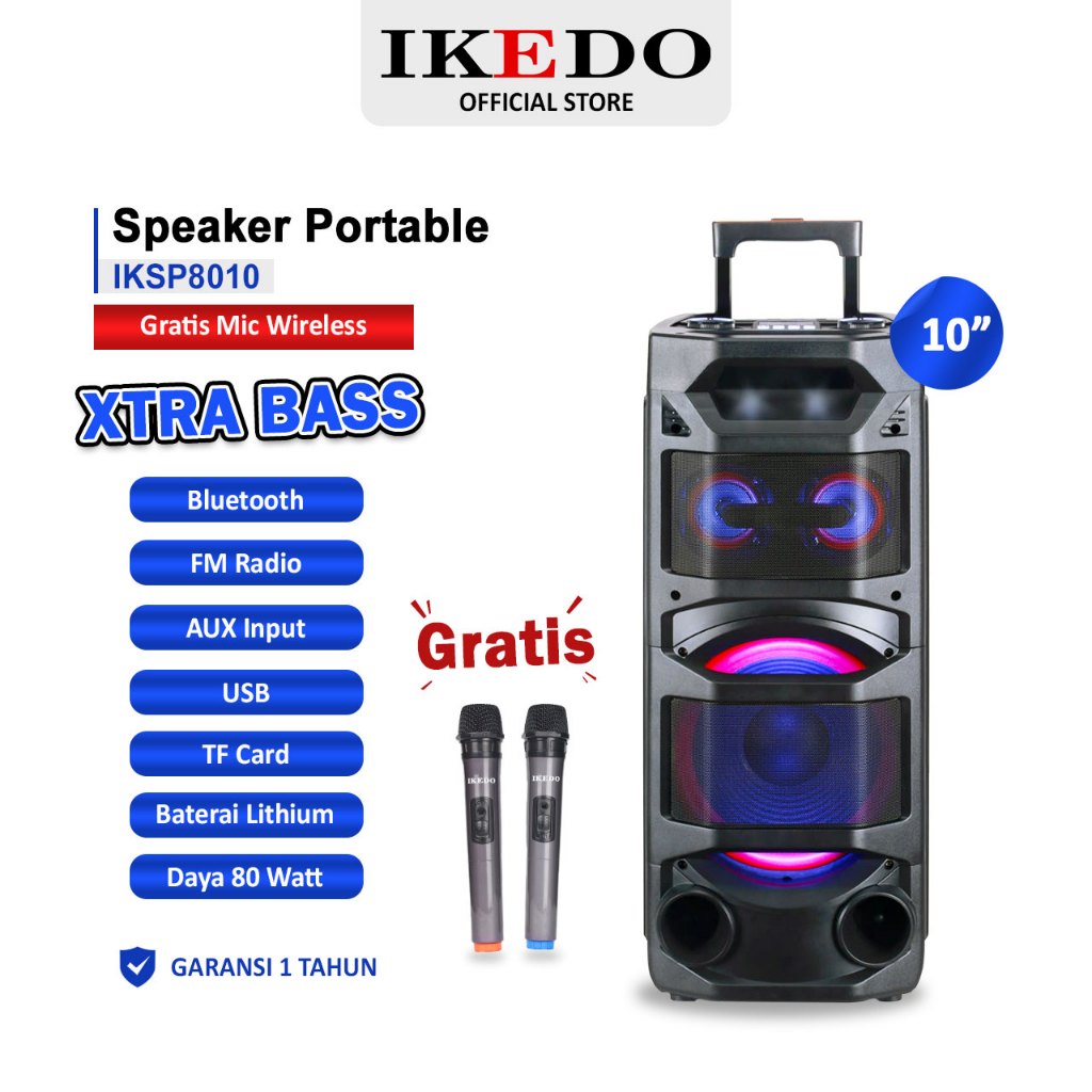 IKEDO Speaker Aktif 10 inch Bluetooth Extra Bass Wireless Karaoke Portable TWS Speaker IKSP8010 [GRATIS PACKING KAYU]