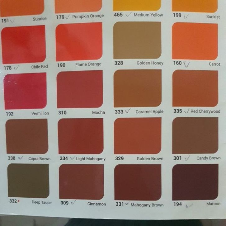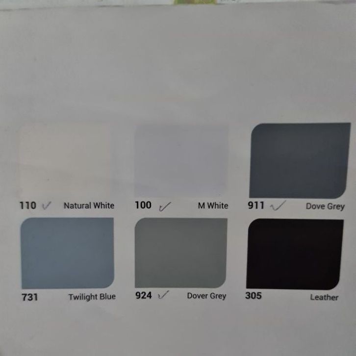 SUPER WHITE / PUTIH, 191 SUNRISE, 178 CHILE RED, 192 VERMILLION, 330 COPA BROWN, 461 PEARL WHITE, 480 LEMONADE, 179 PUMPKIN ORANGE, 190 FLAME ORANGE, 310 MOCHA, 334 LIGHT MAHOGANY, 309 CINNAMON, 370 BROKEN WHITE, 470 BANANA, 465 MEDIUM YELLOW, 328 GOLDEN HONEY, 333 CARAMEL APPLE, 329 GOLDEN BROWN, 331 MAHOGANY BROWN, 462 LUNAR CREAM, 466 GOLDEN YELLOW, 199 SUNKIST, 160 CARROT, 301 CANDY BROWN, 194 MAROON, 660 ALOE VERA, 650 EVERGREEN, 670 SPRING GREEN, 645 LIGHT GREEN, 648 DARK GREEN, 303 SUEDE, 630 KIWI, 662 LIME GREEN, 671 BUD GREEN, 652 PANDAN GREEN, 657 LAUREL, 651 SALEM GREEN, 306 SADDLE BROWN, 631 MINT, 642 COBALT GREEN, 755 BRIGHT BLUE, 732 DIAMOND BLUE, 753 LAKE BLUE, 752 SEA BLUE, 733 OCEAN BLUE, 193 LIGHT PINK DIS, 198 CANDY PINK, 189 GRAPE, 197 ORCHID VIOLET, 100 M WHITE, 110 NATURAL WHITE, 750 DEEP OCEAN, 754 BLUE ROYAL, 731 TWILIGHT BLUE, 924 DOVER GREY, 911 DOVE GREY, 915 DARK GREY, 305 LEATHER, SB SUPER BLACK HITAM, 733M OCEAN BLUE DOF, 911M DOVE GREY DOF, 915M DARK GREY DOF, 301M CANDY BROWN DOF, SBM HITAM DOFF, 309M CINNAMON DOF, PWM PURE PUTIH DOF, SWM SUPER PUTIH DOF, 303M SUEDE DOF, PUTIH BASE A, PUTIH BASE B, B12 006 BEYOND THE S