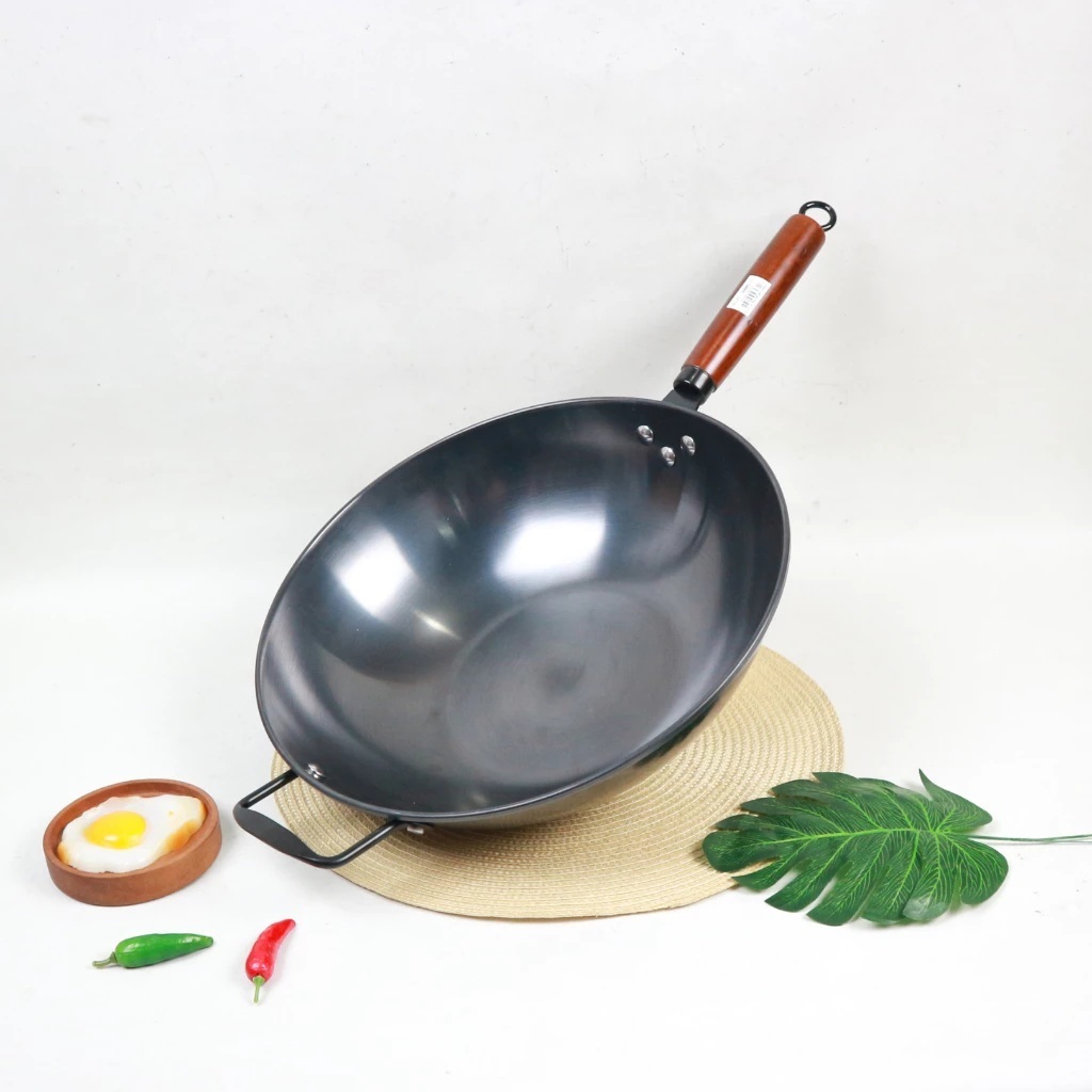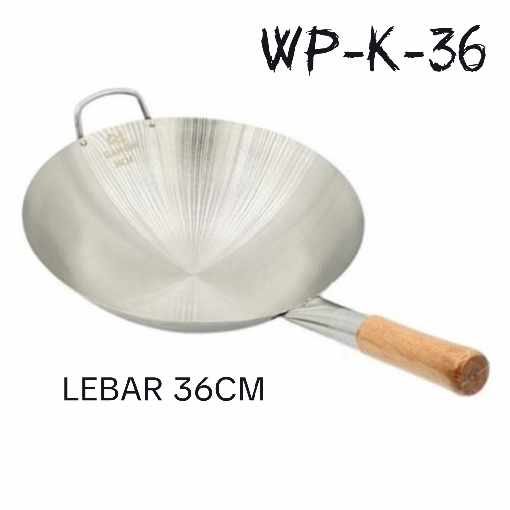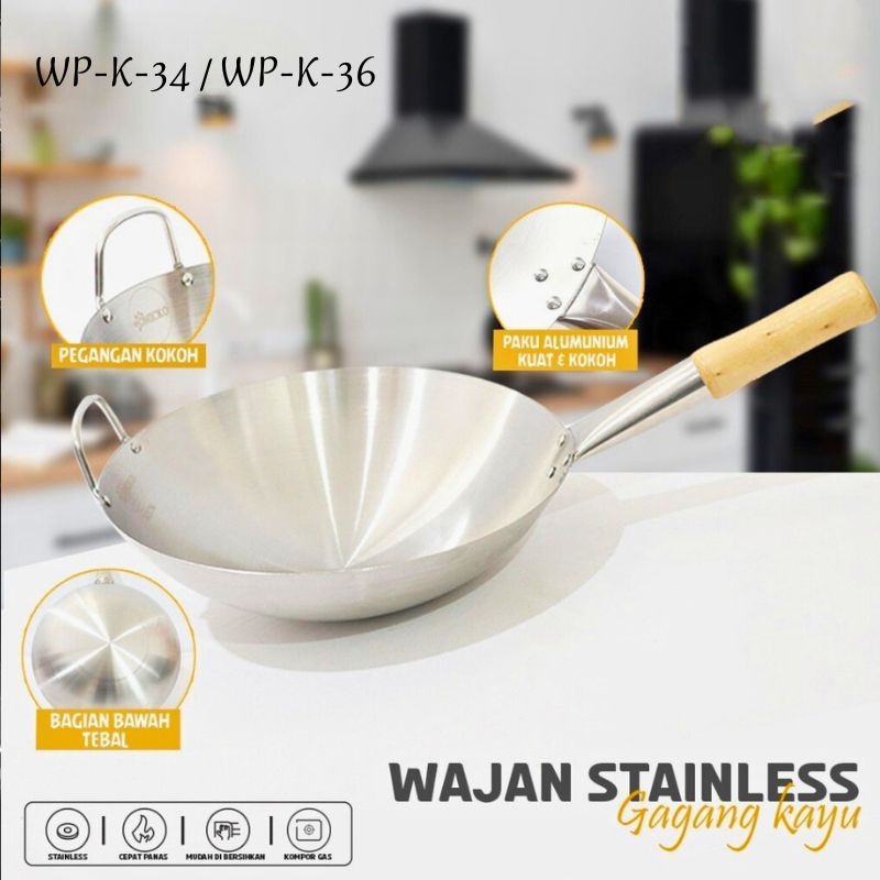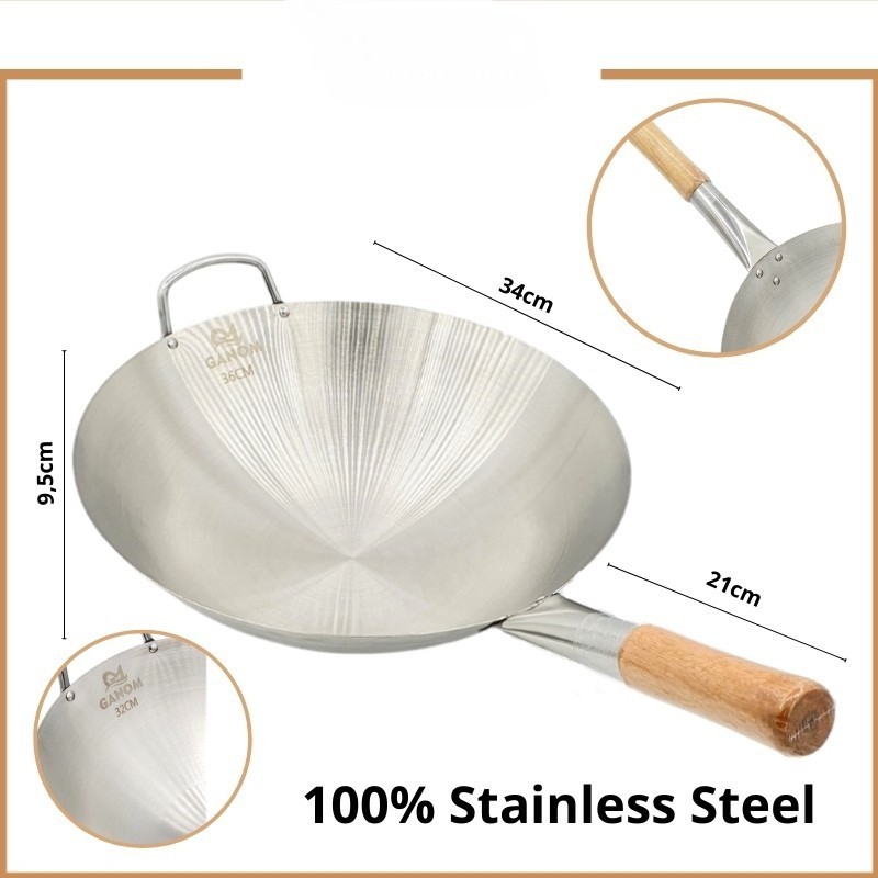 WAJAN PENGGORENGAN KUALI STAINLESS Steel Gagang Kayu Anti Panas Anti Lengket Wok Pan Wajan Nasi Goreng 34CM 36 CM