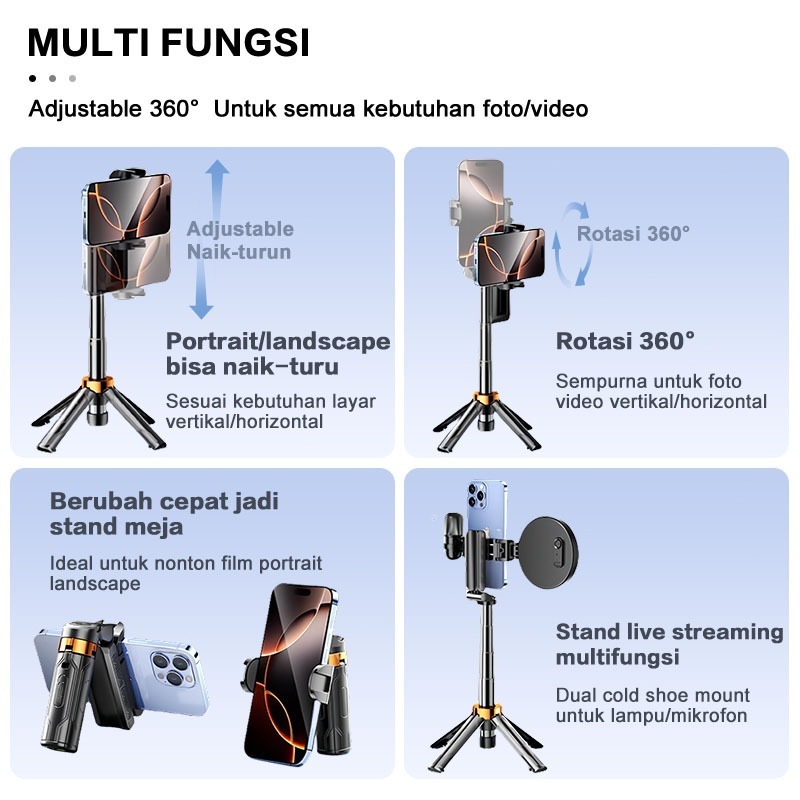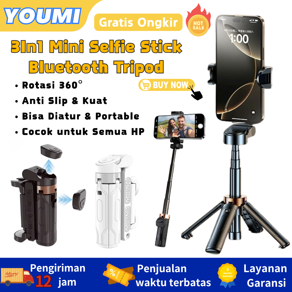 YOUMI (Gratis Ongkir) Tripod HP 3In1 Mini Selfie Stick Tongsis Bluetooth Tripod Handphone Extendable Grip Tripod Anti Go