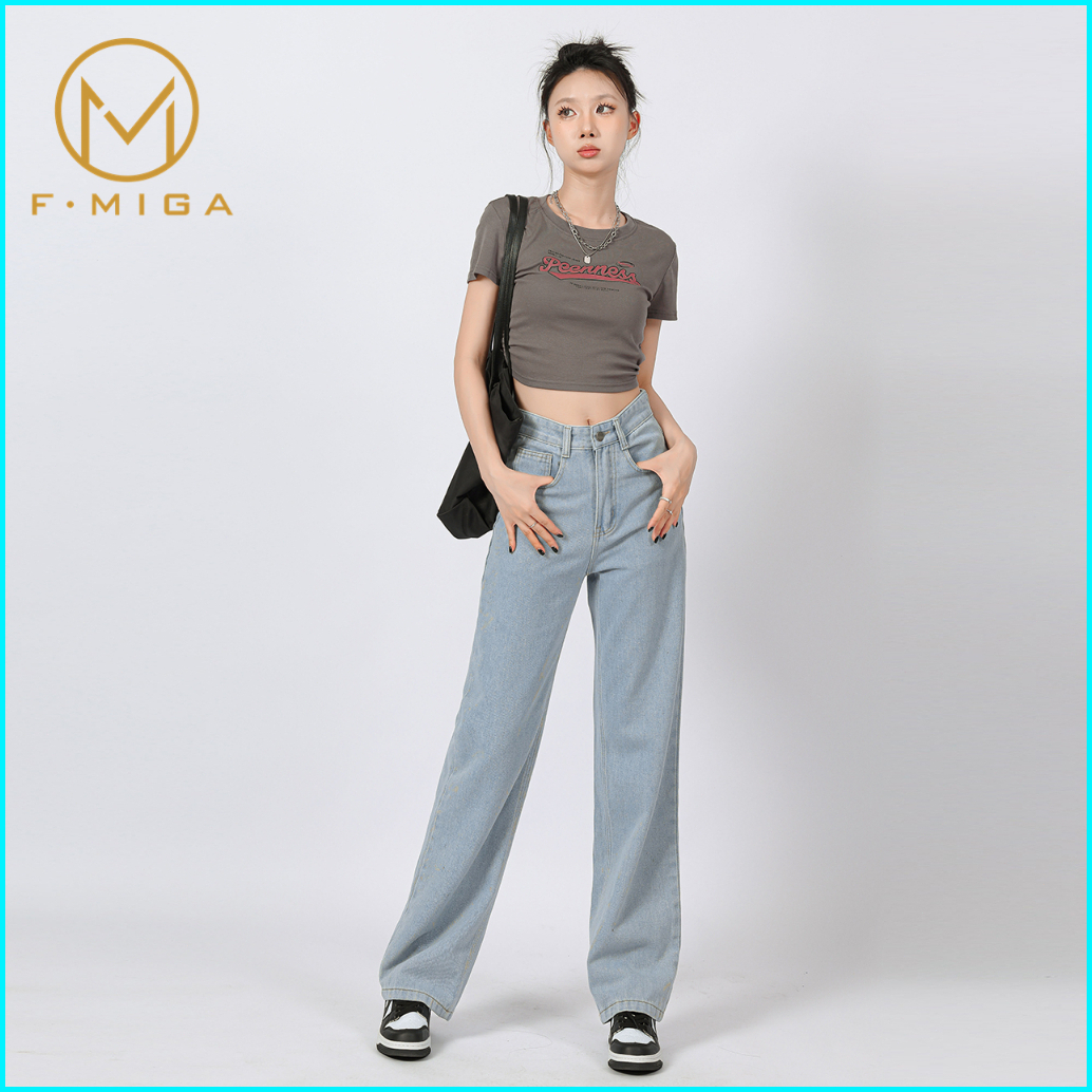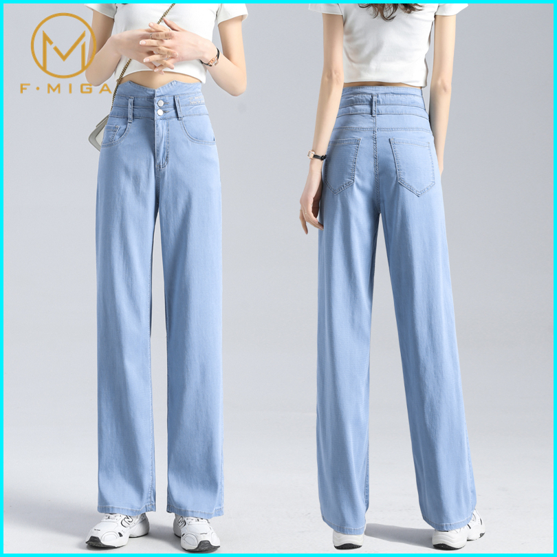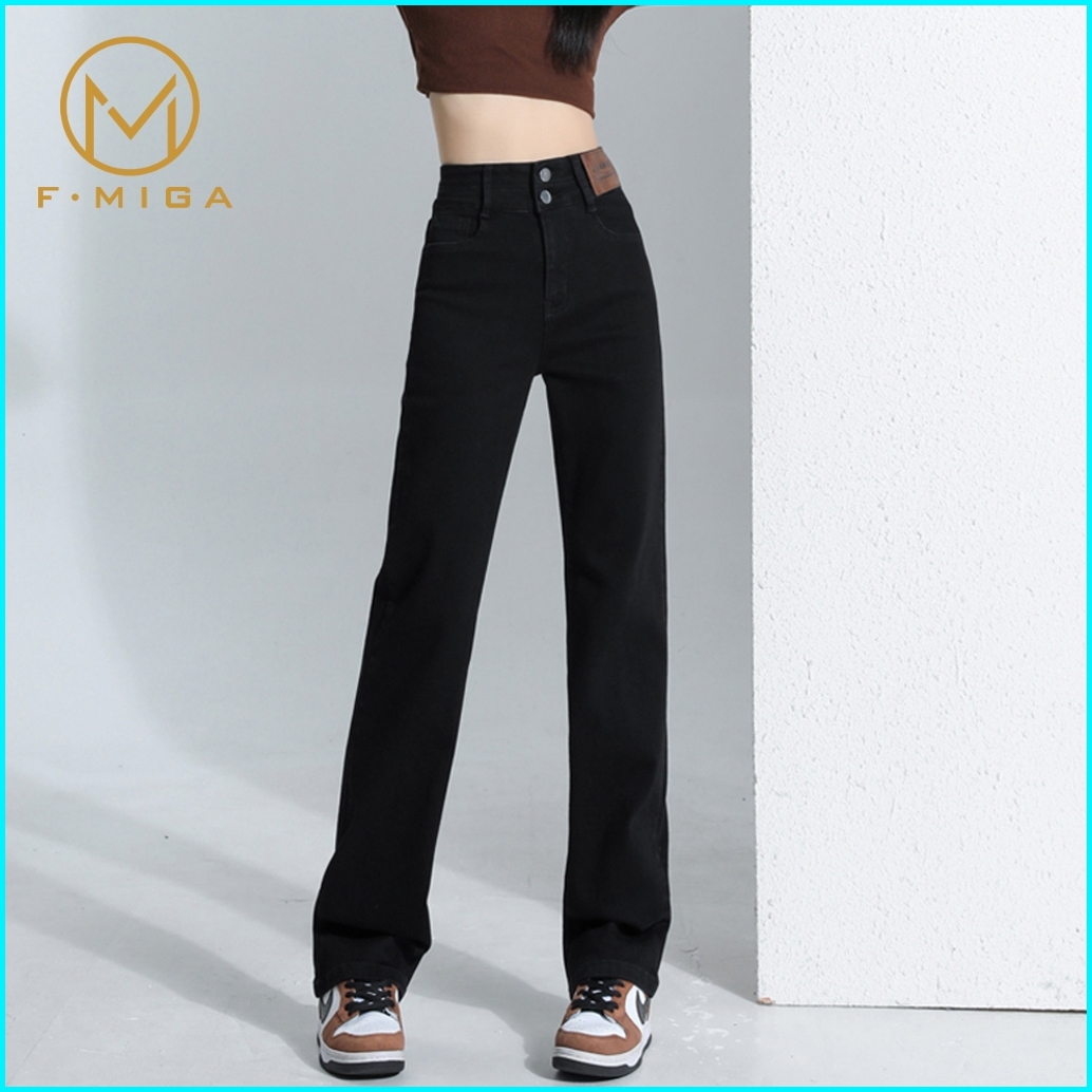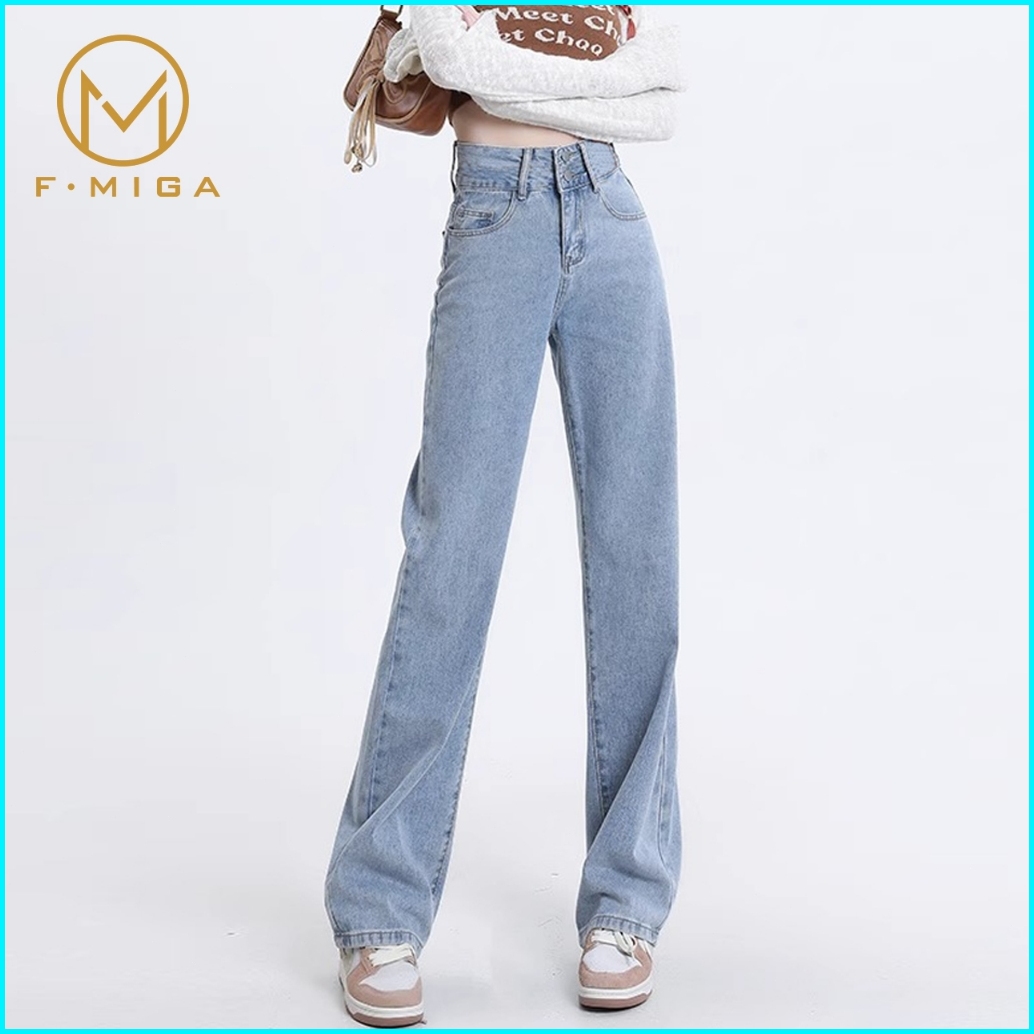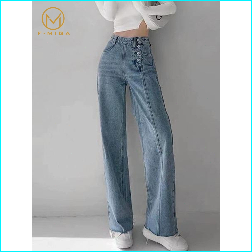 F Miga C23 2025newstyle Highwaist Wanita Jeans Celana Panjang Berkancing Ganda Straight Korean Biru