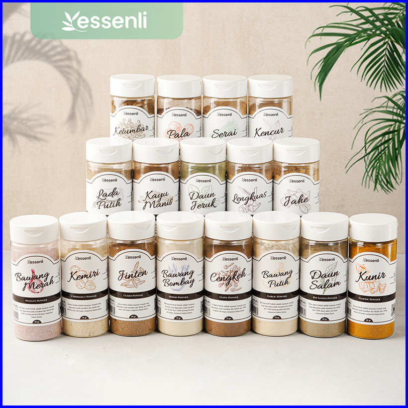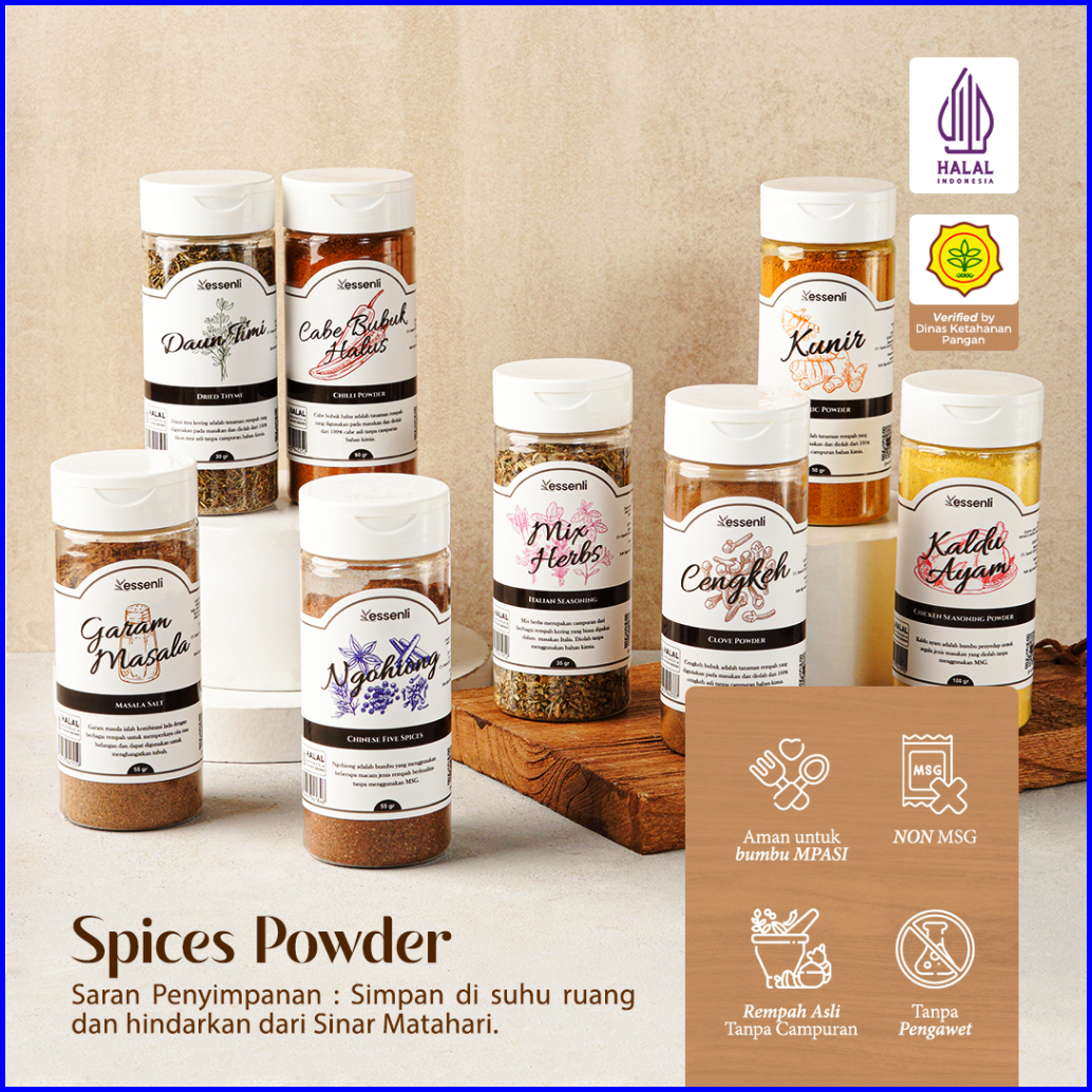 Kunir, Ngohiong, Daun jeruk, Kemiri, Serai, Lada putih, Lada hitam, Cengkeh, Laos, Pala, Bawang Bombai, Bawang Putih, Ketumbar, Kayu Manis, Jahe, Paprika, Rosemary, Mix Herbs, Parsley, Thyme, Basil, Oregano, Bawang Merah, Cabe Halus, Cabe Kasar, Garam Masala, Cajun, Kencur, Kaldu Ayam, Kaldu Sapi, All Seasoning, Daun Salam, Lada Hitam Pecah, Jinten