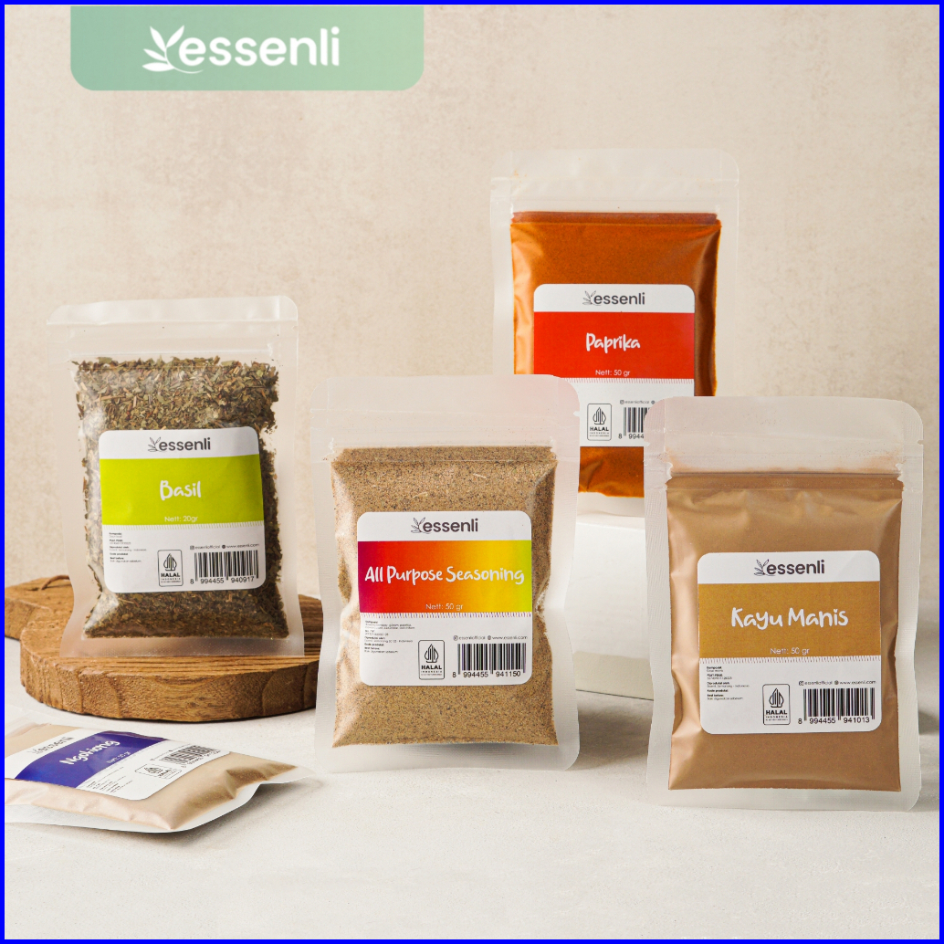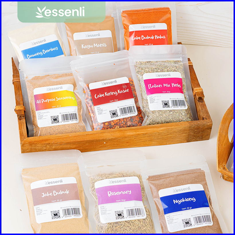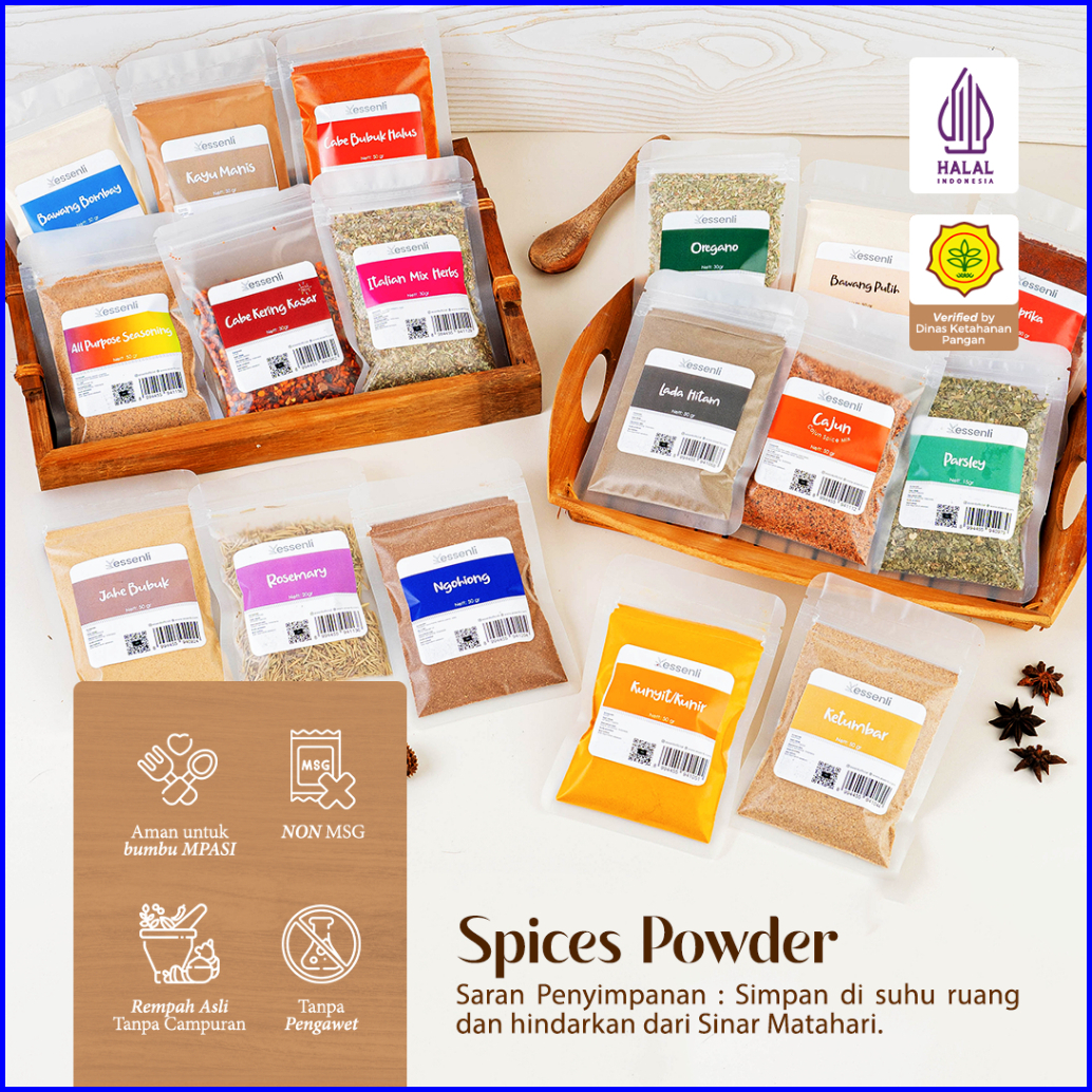 Kunir, Ngohiong, Daun jeruk, Kemiri, Serai, Lada Putih, Lada Hitam, Cengkeh, Laos, Pala, Bawang Bombai, Bawang Putih, Ketumbar, Kayu Manis, Jahe, Paprika, Oregano, Mix Herbs, Rosemary, Basil, Thyme, Parsley, Bawang Merah, Cabe Halus, Cabe Kasar, Garam Masala, Cajun, Garam Laut, Garam Himalaya, Kaldu Ayam, Kaldu Sapi, Kencur, All Seasoning, Daun Salam, Lada Hitam Pecah, Jinten, Kaldu Jamur
