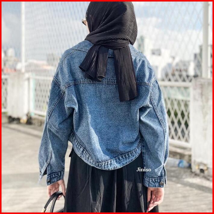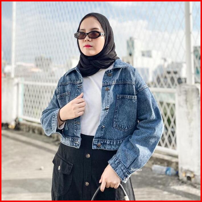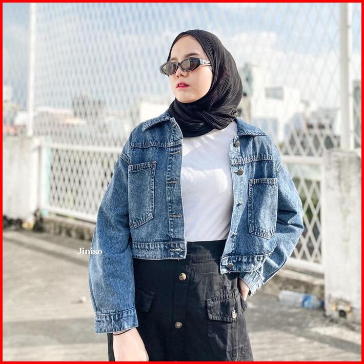Jiniso Jaket Crop Jeans Oversize Pocket Blue Acid
