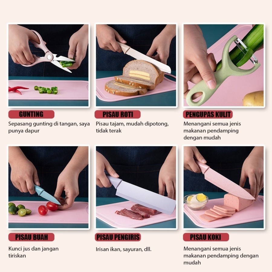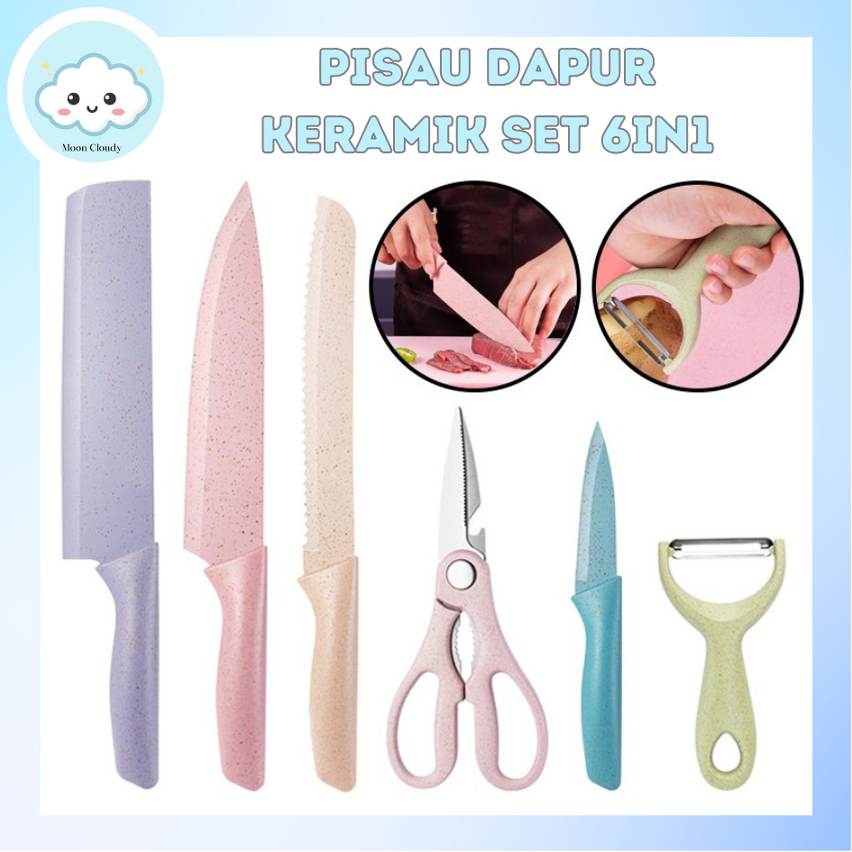 Pisau Dapur Keramik Set 6 in 1 EVCRIVERH Stainless Steel Anti Lengket Warna Pastel Anti Slip Kitchen Knife Macaron Gunti