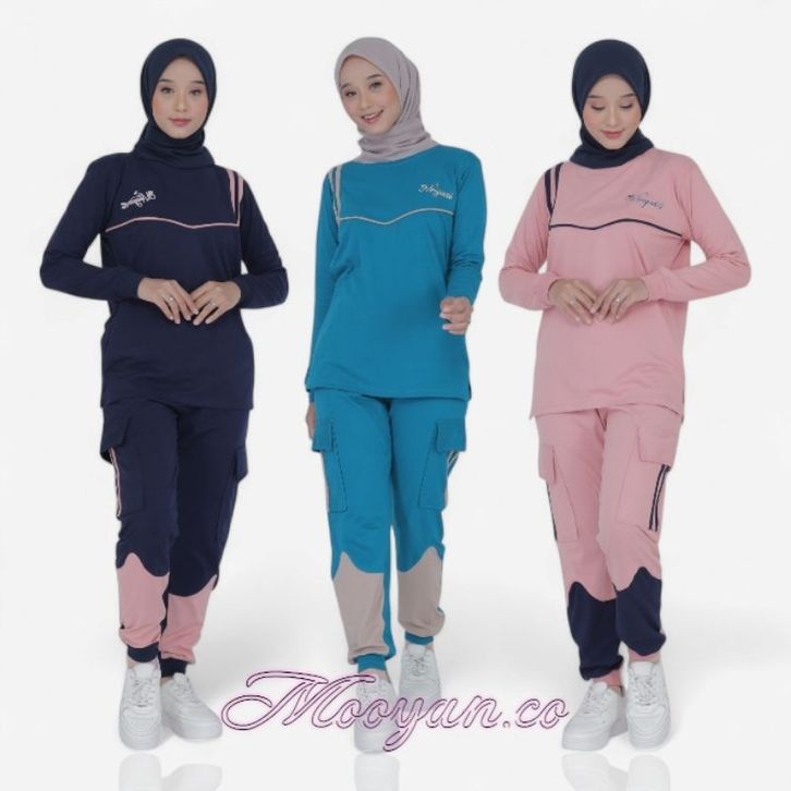 Baju Olahraga Wanita Muslim Agli One Set Celana Cargo Wanita Muslimah Jumbo Baju Senam Jogging Bersepeda Simple