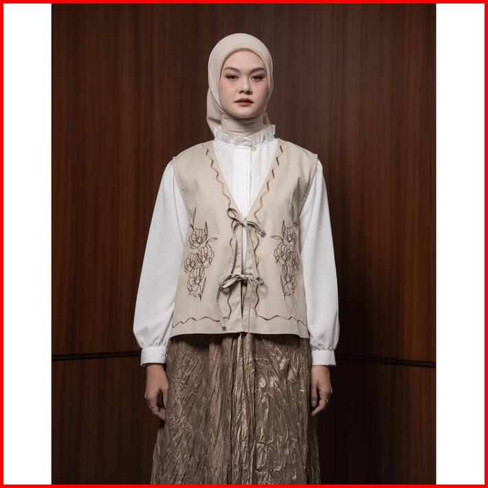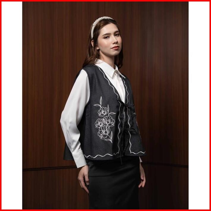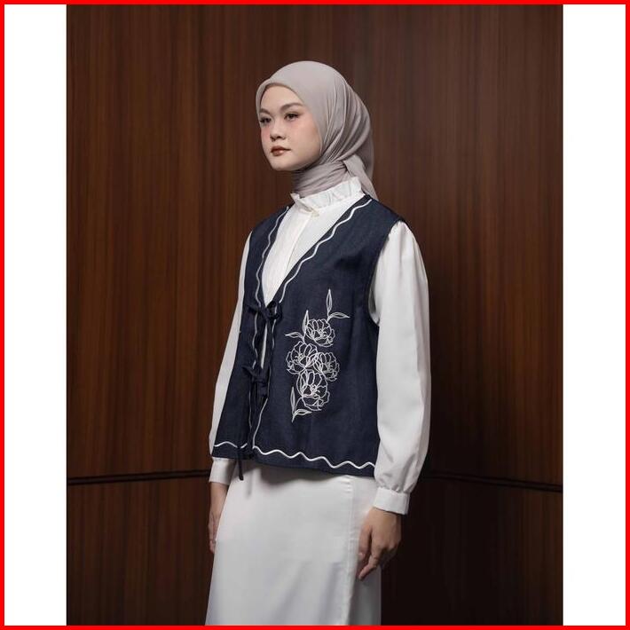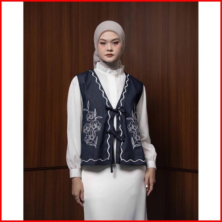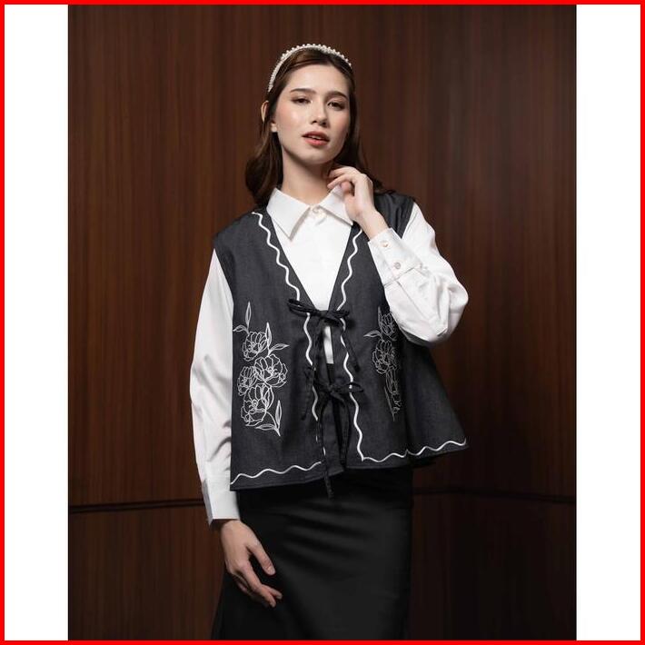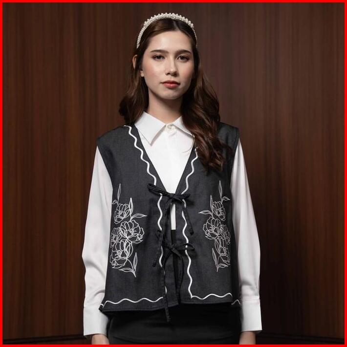 Mayoutfit Brinley Vest Outer Rompi Wanita Denim Bordir Bunga Embroidery Tali Pita