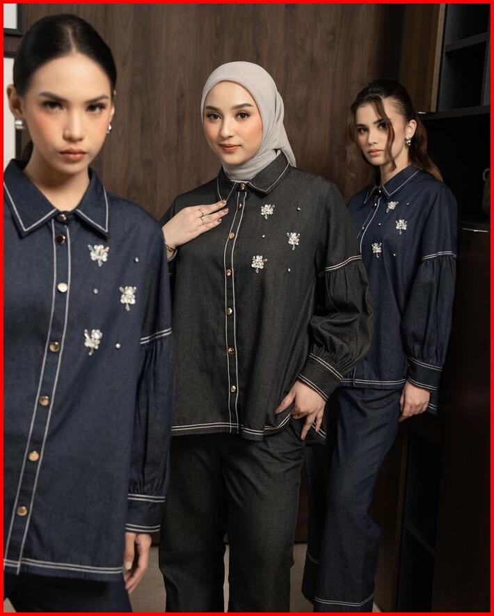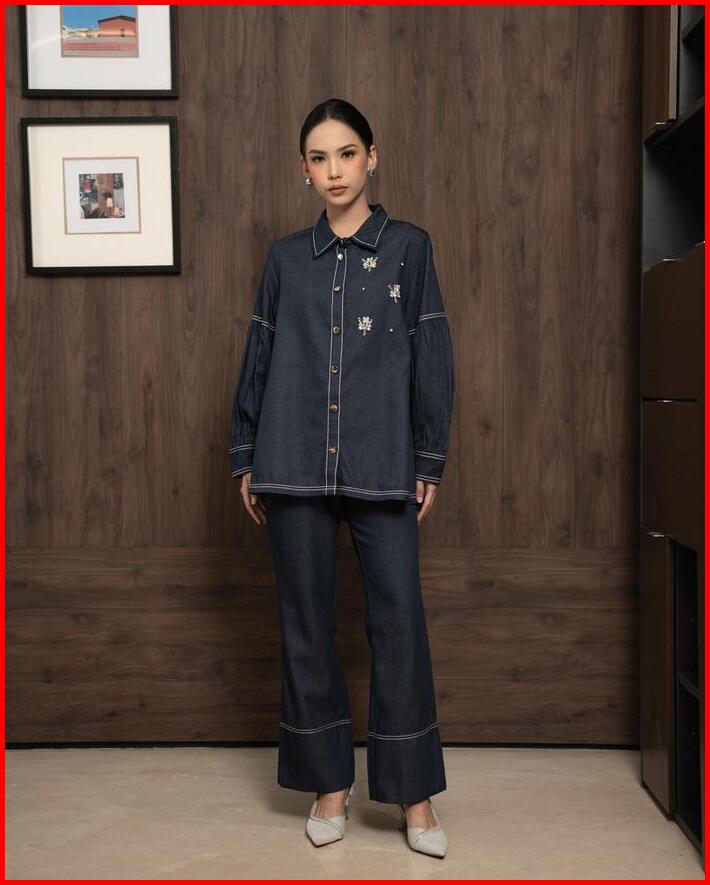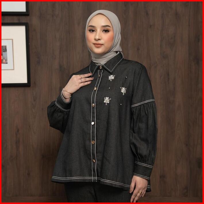 Mayoutfit X Dinan Fajrina Gaela Shirt Kemeja Denim Wanita Basic Aksen Payet Beads