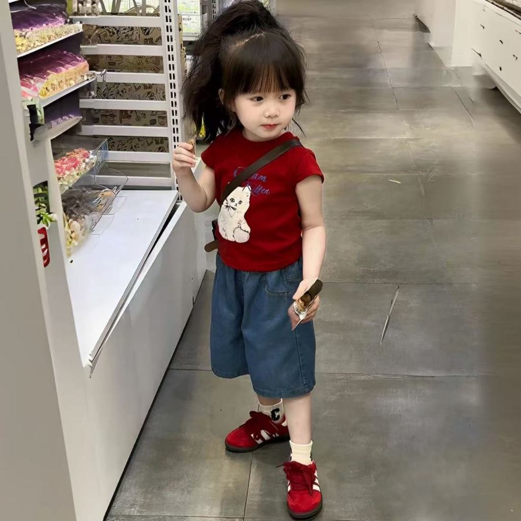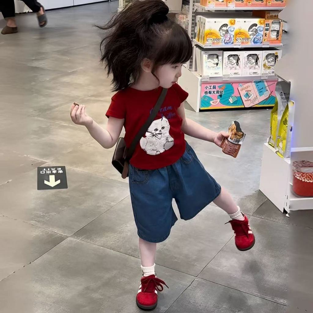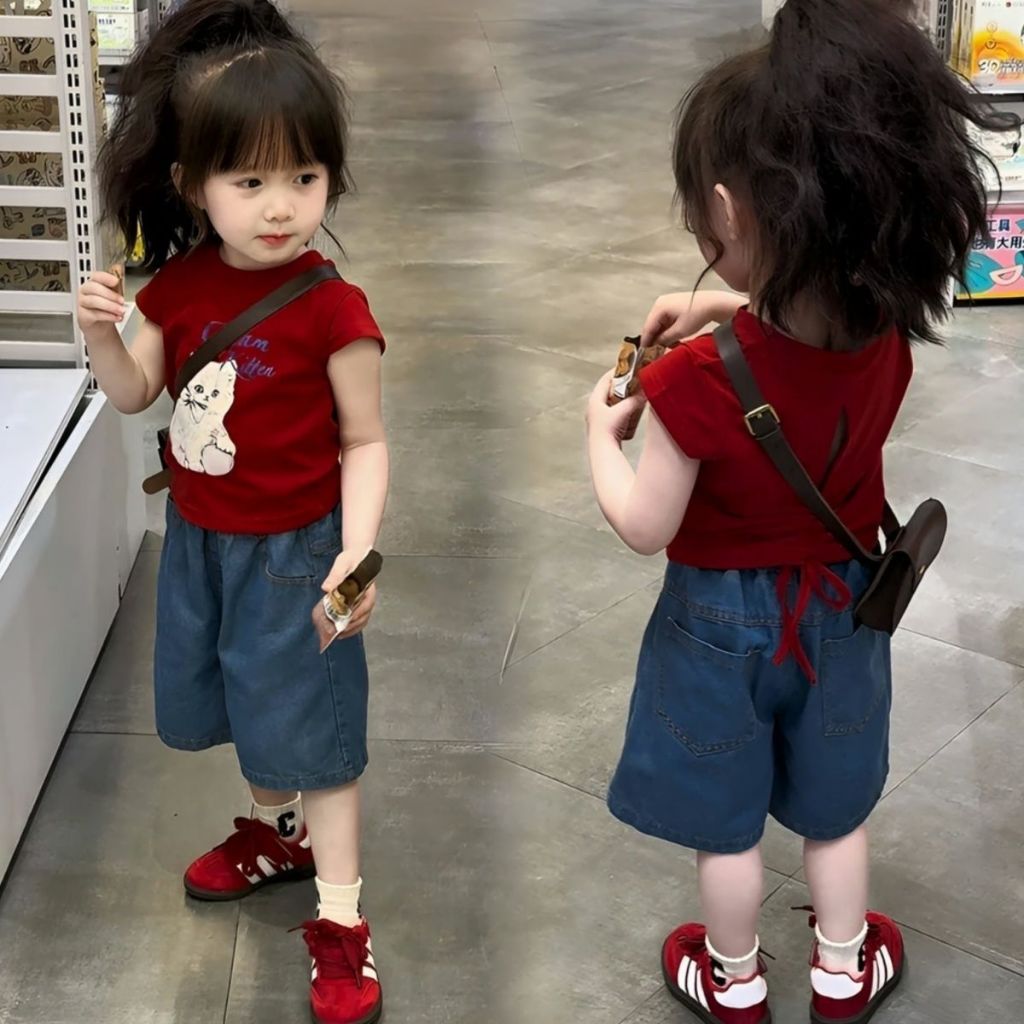 Korea Style Setelan Jeans Anak Perempuan One Set Atasan Bahan Katun Design Khusus+ Celana Jeans Pendek Baju Anak Perempu