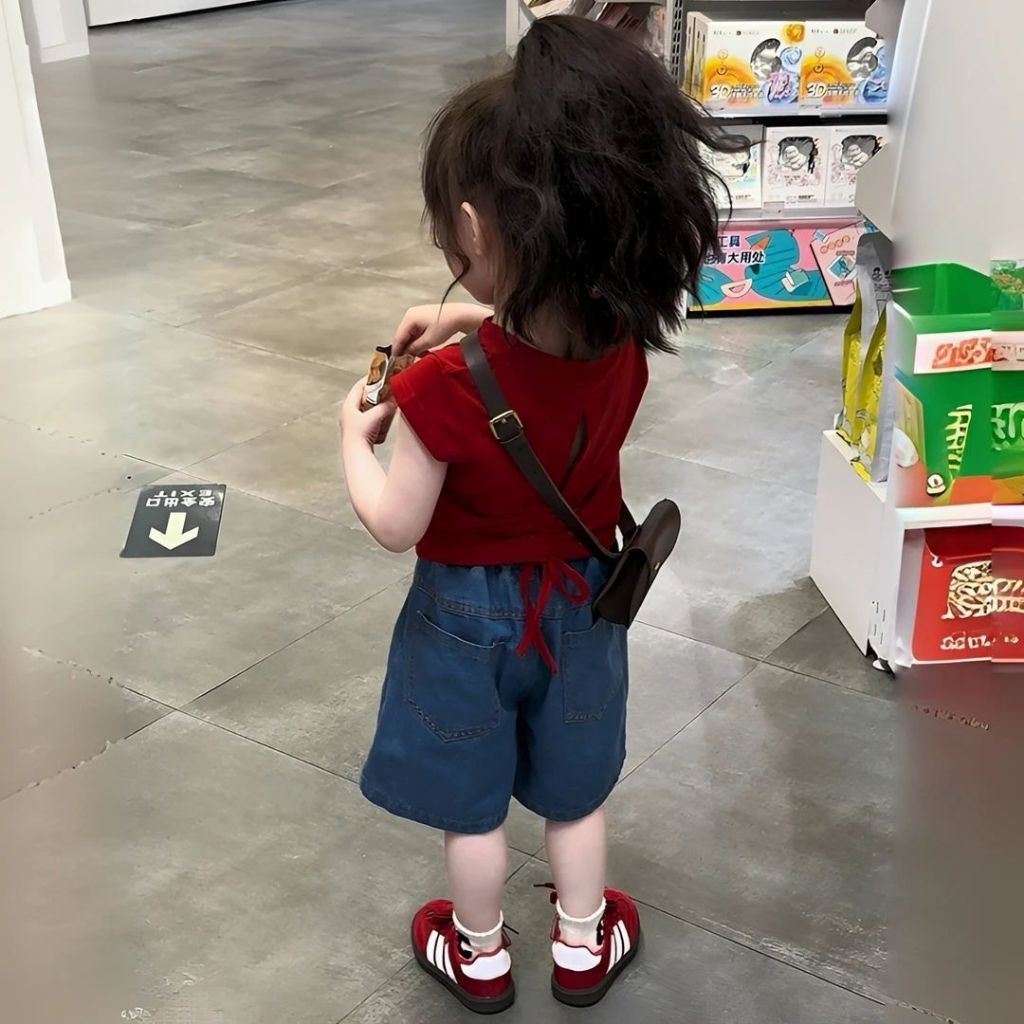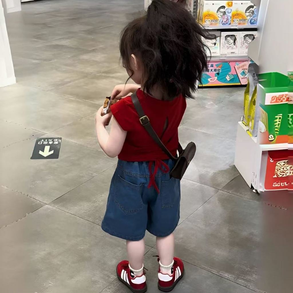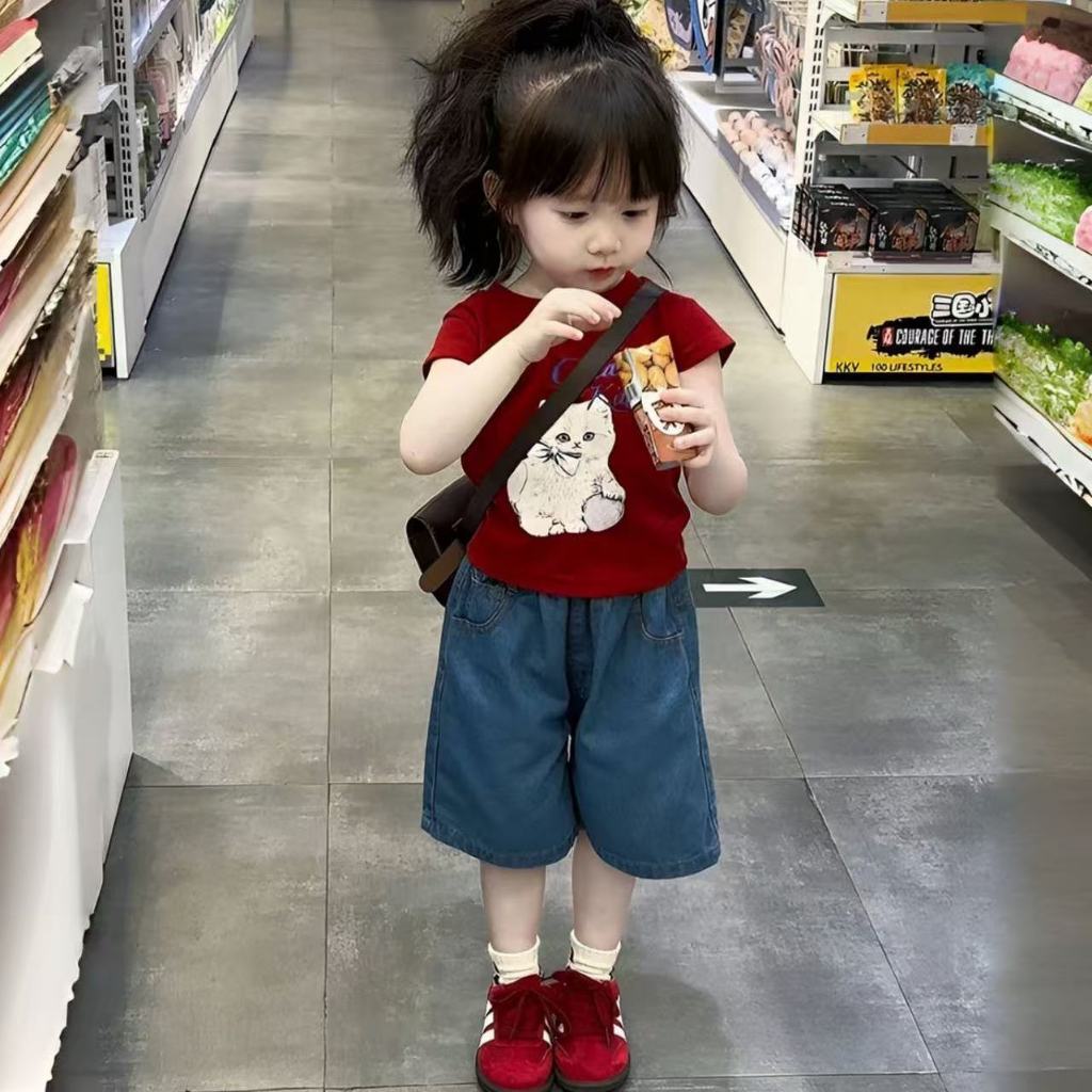 Korea Style Setelan Jeans Anak Perempuan One Set Atasan Bahan Katun Design Khusus+ Celana Jeans Pendek Baju Anak Perempu
