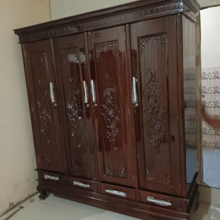 Lemari Pakaian Baju Rak Lemari Hijab 4 Pintu Laci Bahan Full Kayu Jati Anti Rayap Mebelium