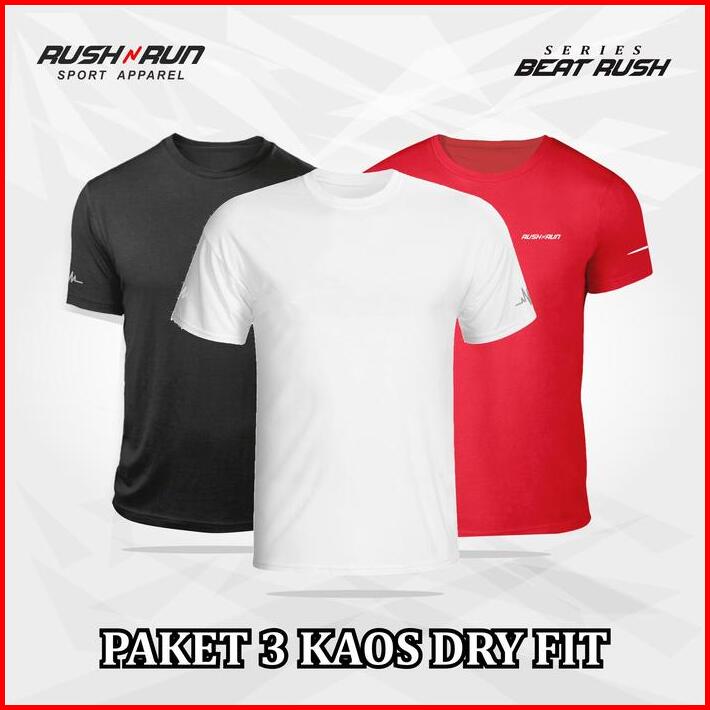 Paket 3 Pcs Baju Kaos Olahraga Pria Sport T-shirt By Rush N Run Bahan Dryfit Nyaman Berpori Wanita