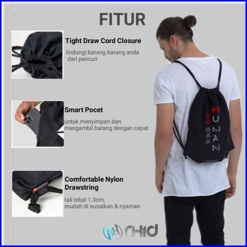 Rhid - Tas Ransel Serut Hitam Original Futsal Olahraga Stringbag Anti Air