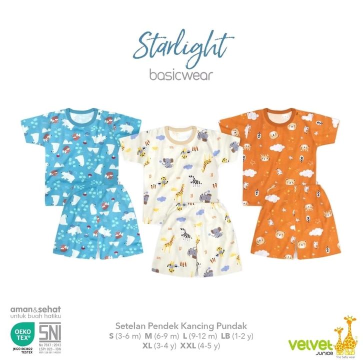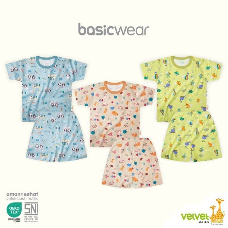 VELVET JUNIOR 3PCS SETELAN BAYI PENDEK VELVET JUNIOR MOTIF NB,Smili,LB,XL,XXL.SNI