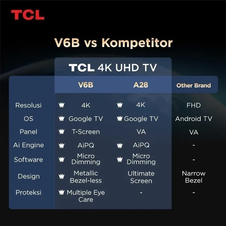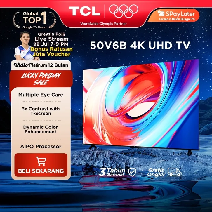 TCL SMART TV 50 INCH V6B - UHD - T-SCREEN - DOLBY AUDIO - HDR10 - AIPQ PROCESSOR - DYNAMIC COLOR ENHANCEMENT BERKULITAS