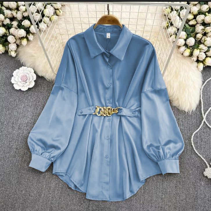 MELDA Safaraz Kemeja Wanita Polos Motif Rantai Lengan Balon Korean Style Oversize Jumbo M L XL XXL