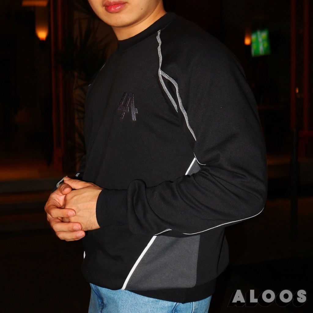 Aloos Crewneck Ovedeck + White Line - Black Charcoal | Sweater Bordir Kombinasi Katun Fleece 280 Gsm