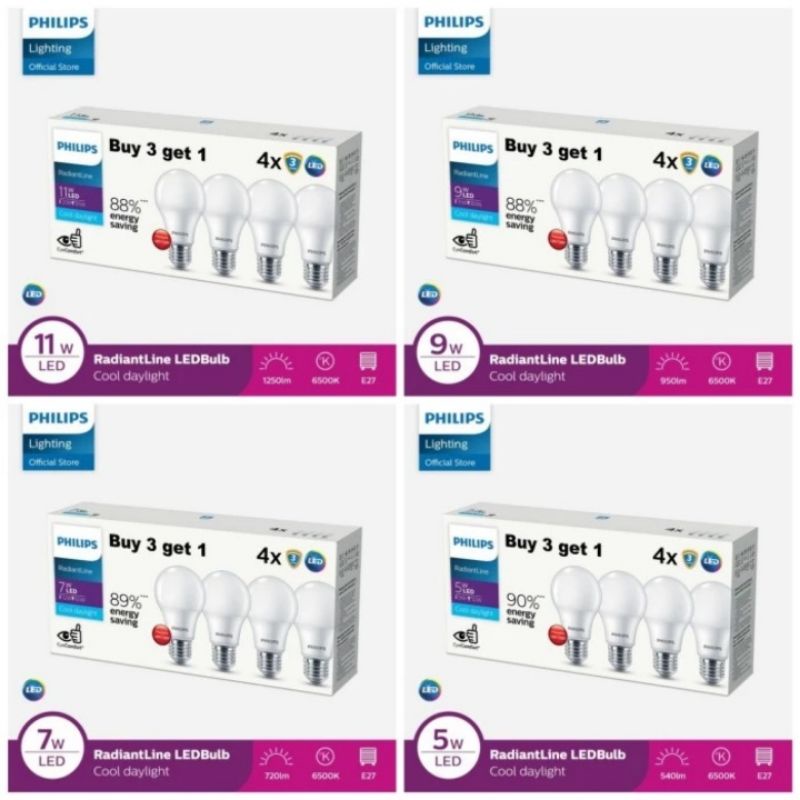 Paket Lampu LED Philips 5W 7W 9W 11W RadiantLine Beli 3 Gratis 1 Multipack - Putih 6500K
