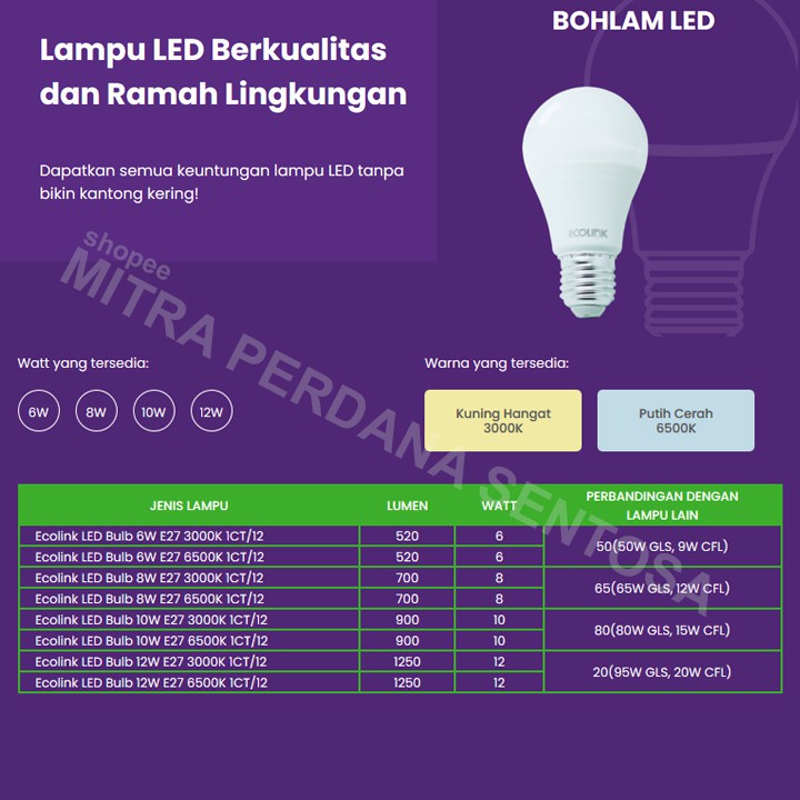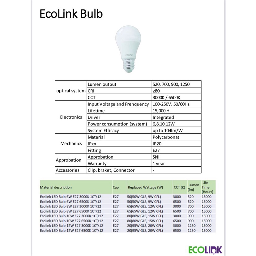 Paket 12 pcs Ecolink Lampu Bohlam LED Bulb 10 watt Putih 6500K Kuning 3000K TAHAN LAMA SUPER TERANG