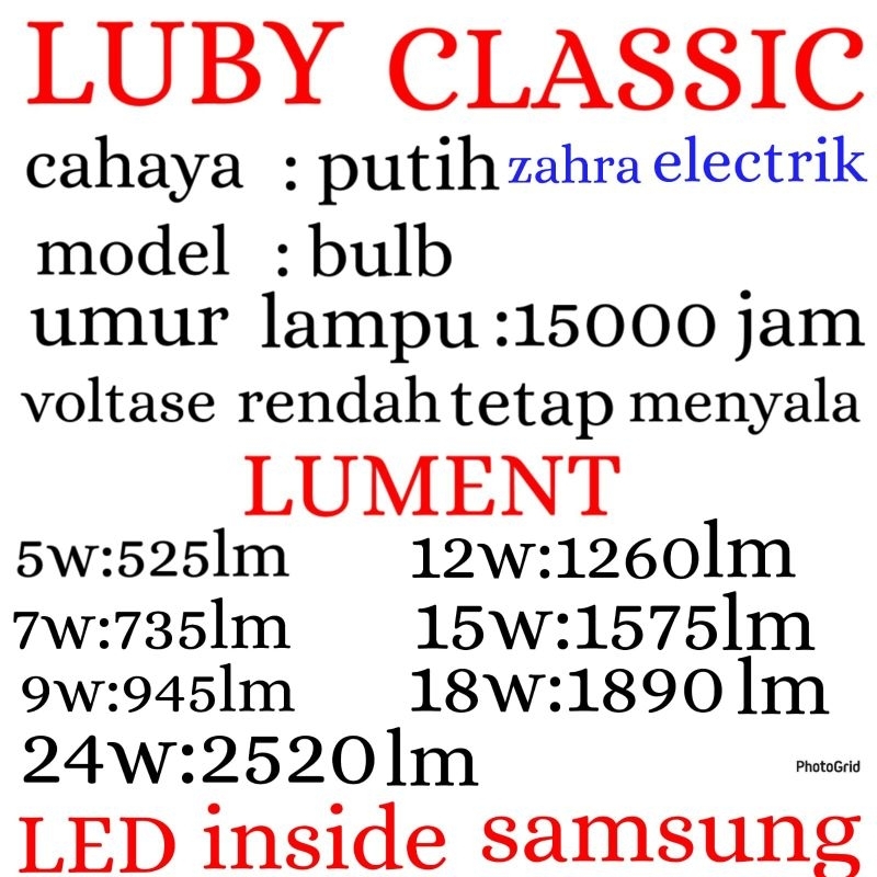 BOHLAM LED / LAMPU LED GARANSI 1 TAHUN LUBY CLASSIC CAHAYA PUTIH 5W-24W