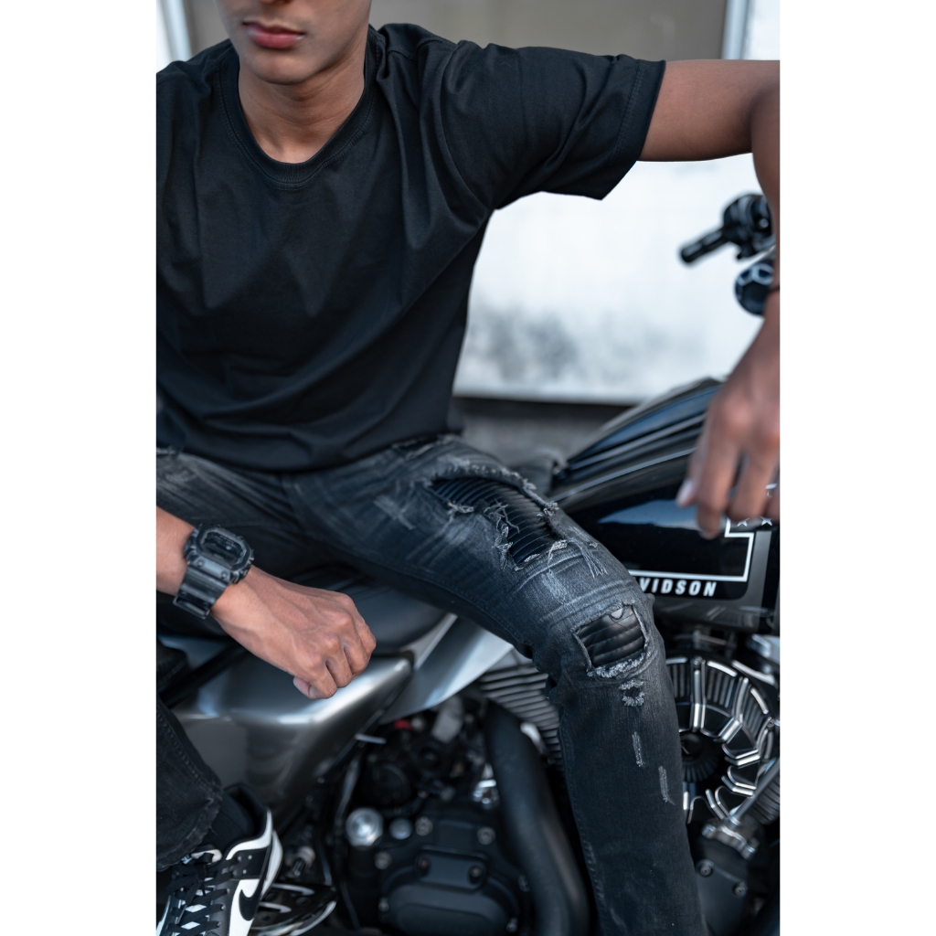 Chickcool Black Skin Street Bikers Edition Celana Jeans Pria Skinny Strech Ripped Tambal Leather Denim Fit