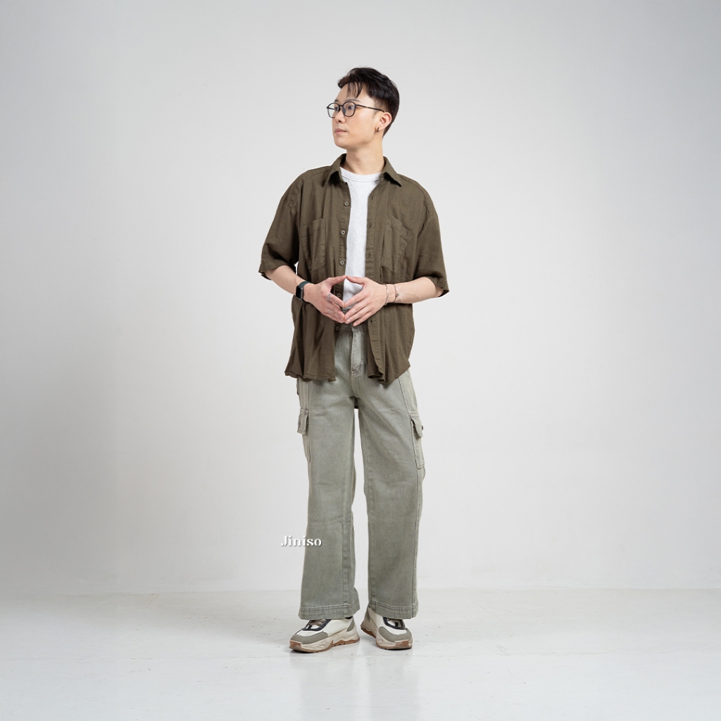 Jiniso - Denim Loose Cargo Jeans Pria Unisex Vintage