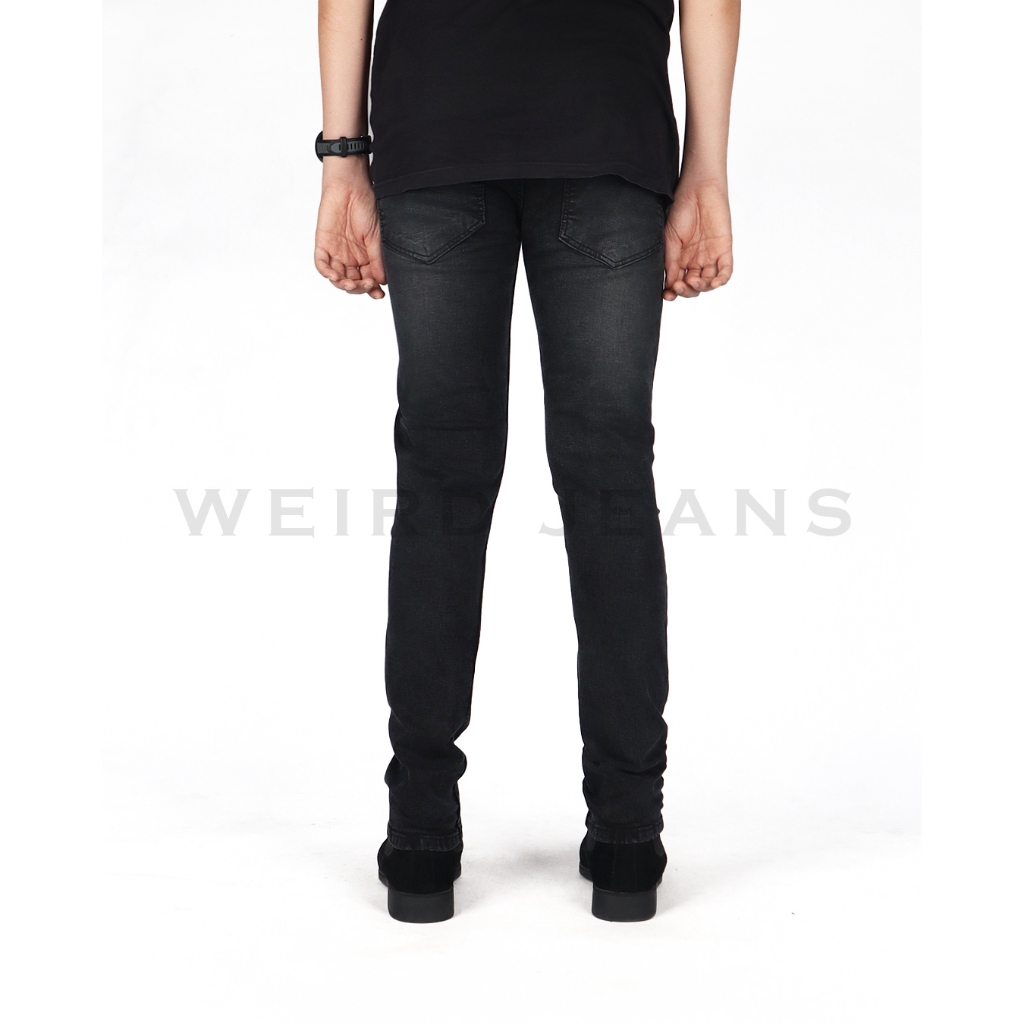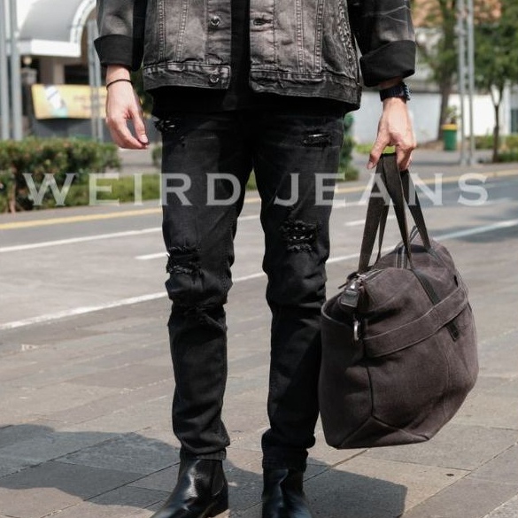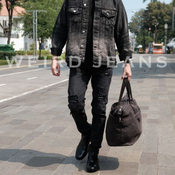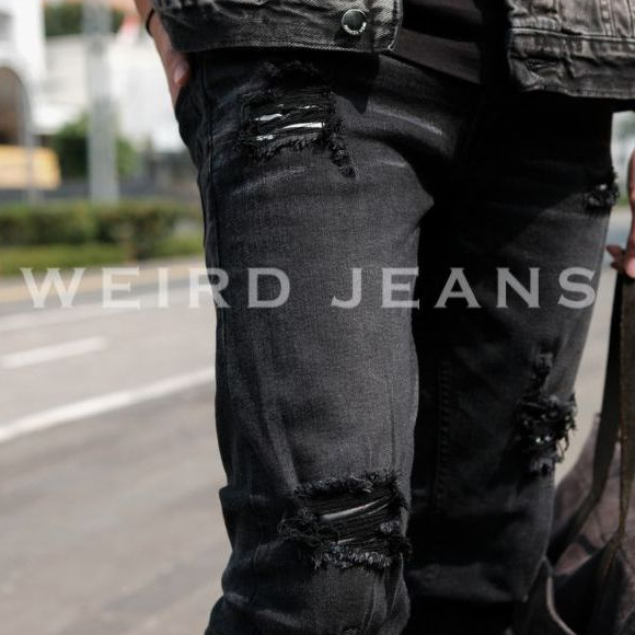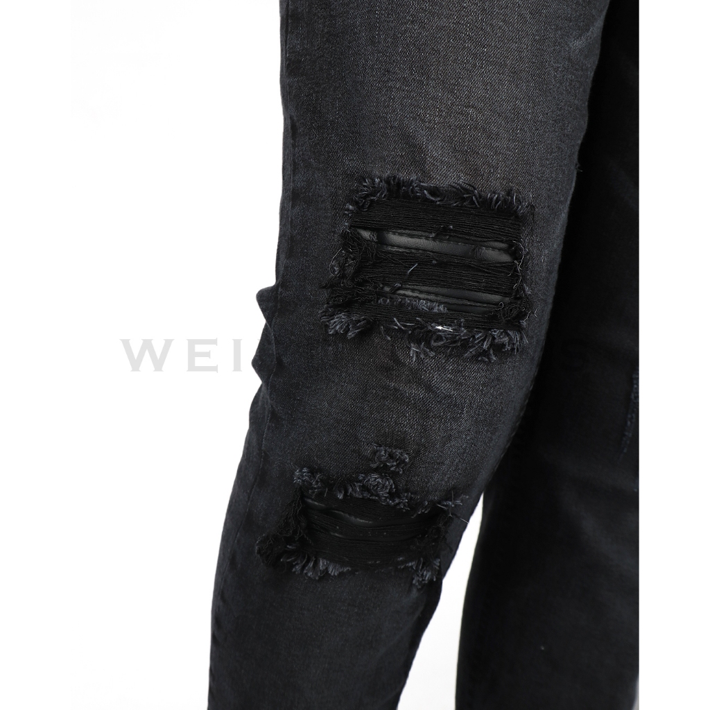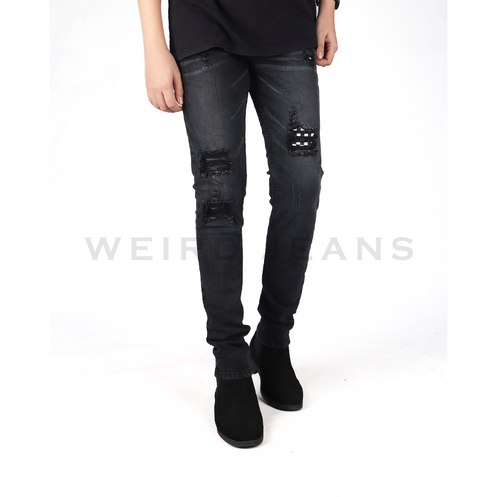 Weird Jeans - Hugo Black - Celana Jeans Panjang Denim Pria Slim Fit Warna Hitam Ripped Tambal Leather