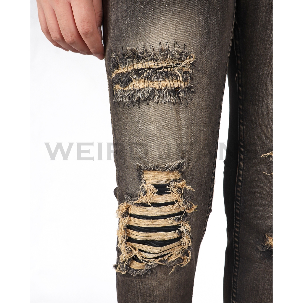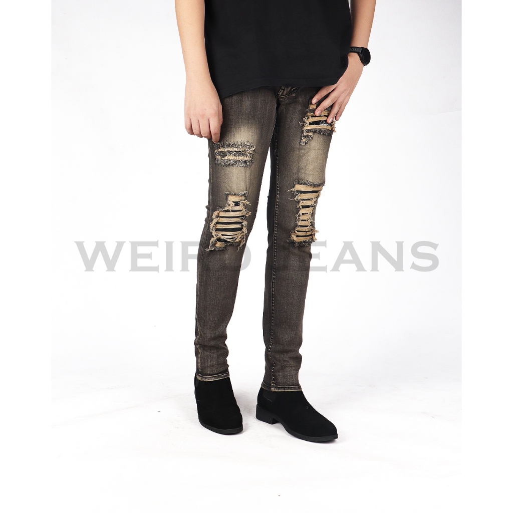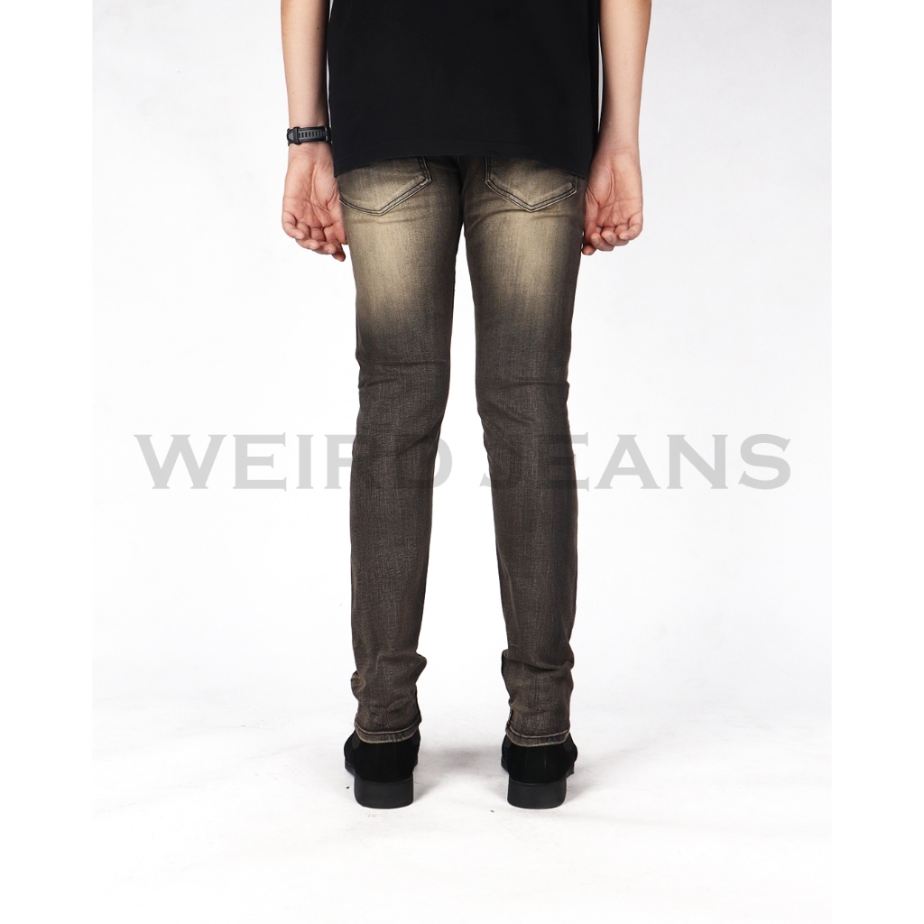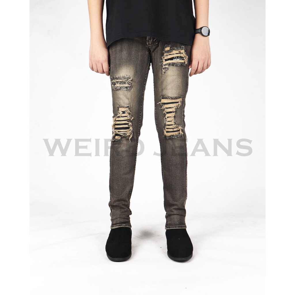 Weird Jeans - Earth Grey - Celana Jeans Panjang Pria Slim Fit Strech Ripped Leather Kain