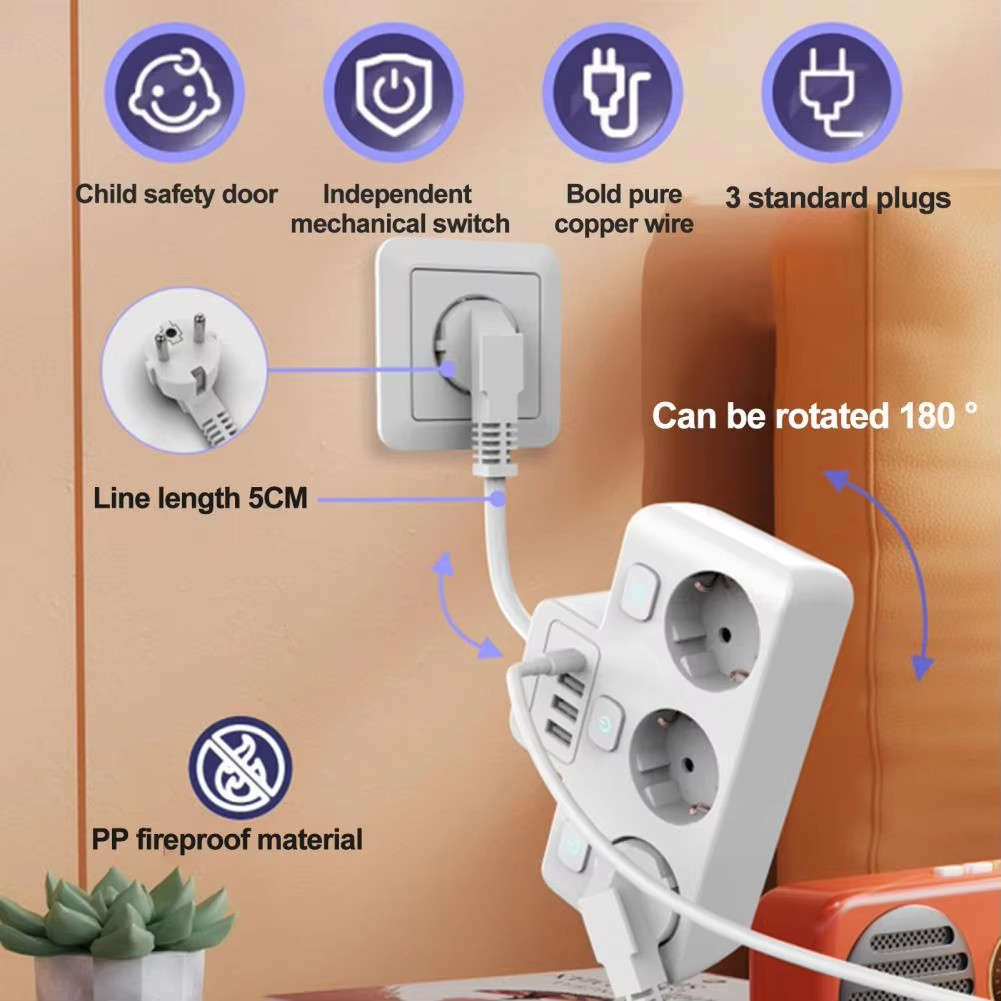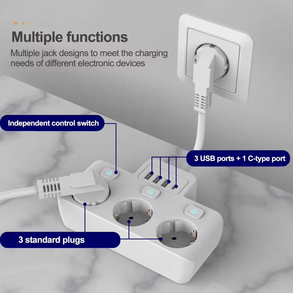 European Plug Adapter with USB Ports Travel Use Plug Adapter Type-C Power Strip Stop Kontak 3 Power Sockets 4 USB Charger