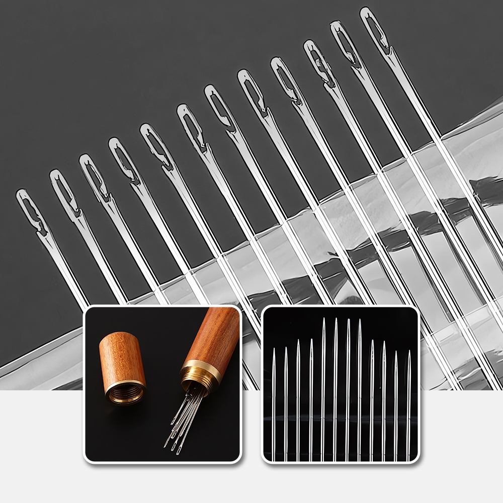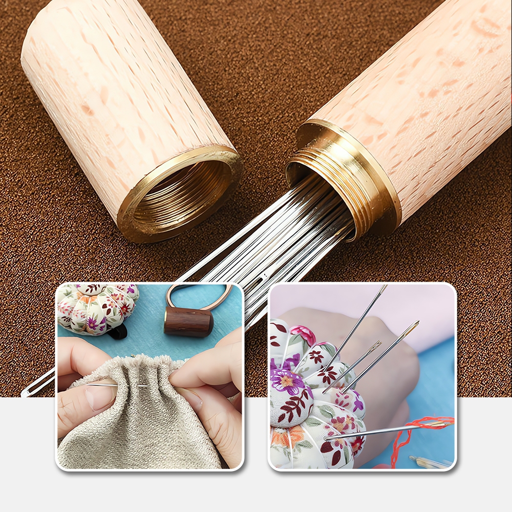 Jarum Jahit Tangan Stainless Steel Mata Jarum Lubang Besar Wadah Kayu Praktis Jahit Bahan Tebal Tipis 1 set