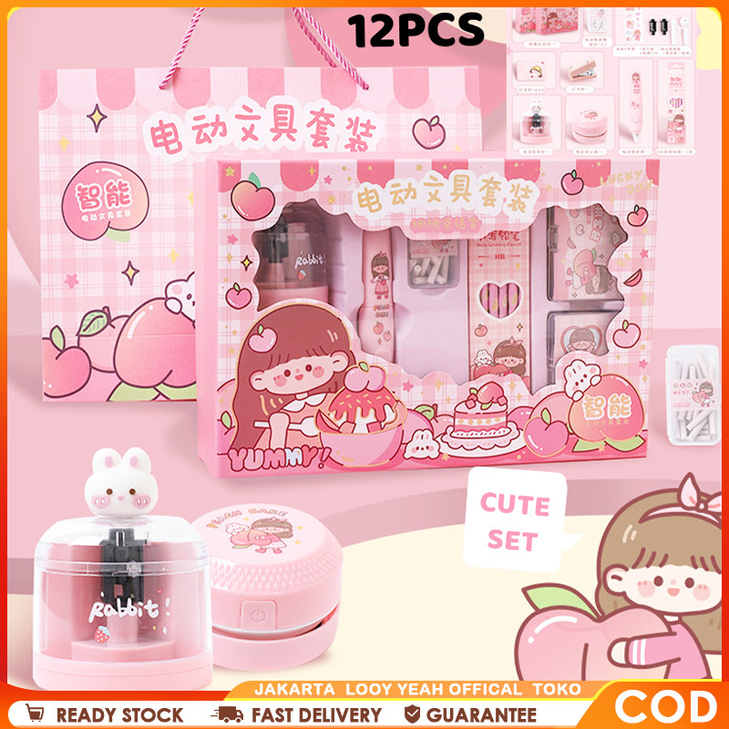 12 IN 1 Set Alat Tulis Listrik Rautan Penghapus Vacuum Pensil Anak Alat Perkakas Belajar Electric Stationery Set-Hadiah