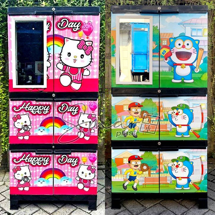 Terlaris LEMARI PLASTIK 4 SUSUN TINGKAT JUMBO GANTUNG RAK PAKAIAN KABINET CERMIN FULL KUNCI HELLO KITTY DORAEMON SERBA