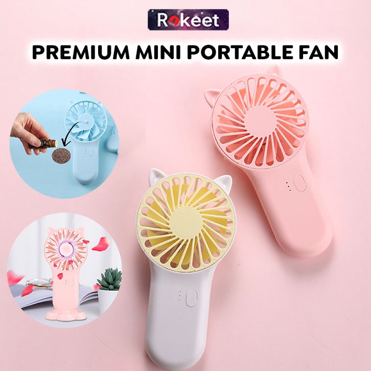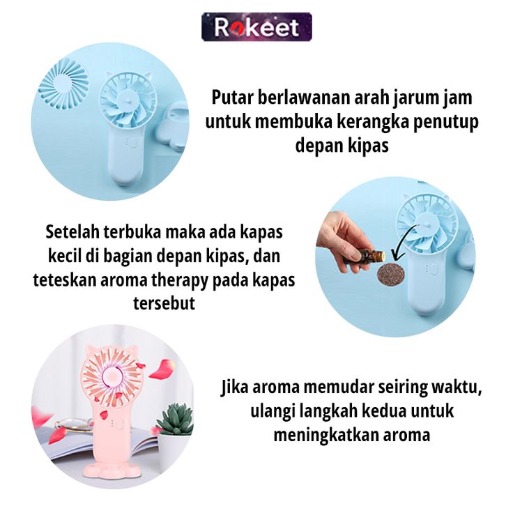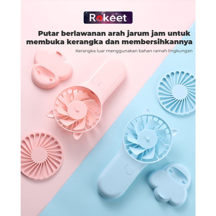 GROSIR Rokeet Kipas Angin Mini Portable Karakter Genggam Elegan Kencang Rechage Tahan Lama edorr