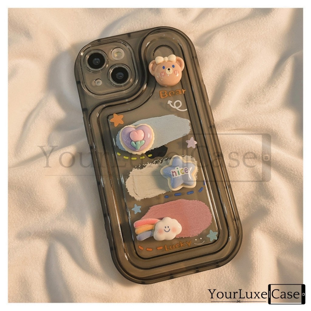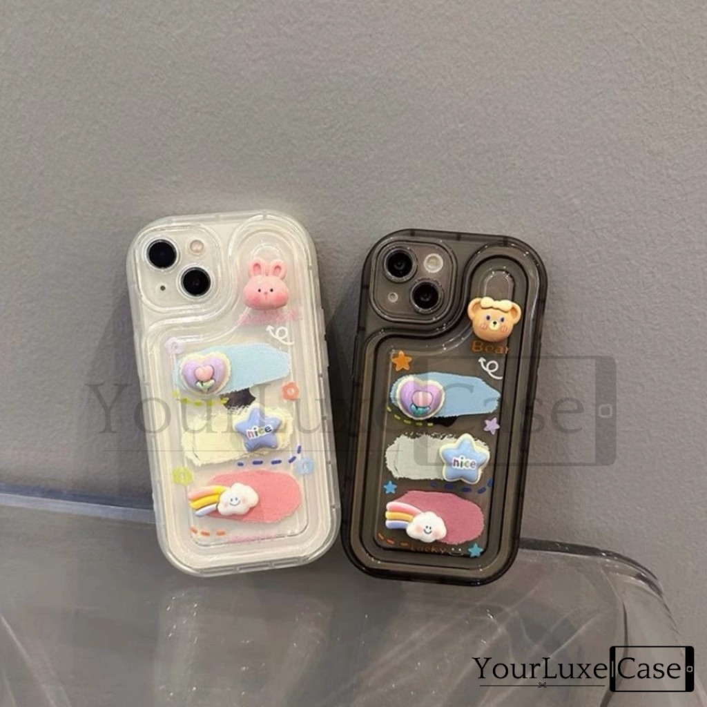 4D Fluffy Bunny and Bear Clear Case HP Casing iPhone 7 8 X XR XS 11 12 13 14 15 16 Plus Pro Max 7+