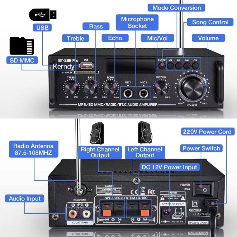Amplifier KERNDY BT-298 PRO ECHO Bluetooth EQ Audio Ampllifier Karaoke Home Theater FM Radio 800W