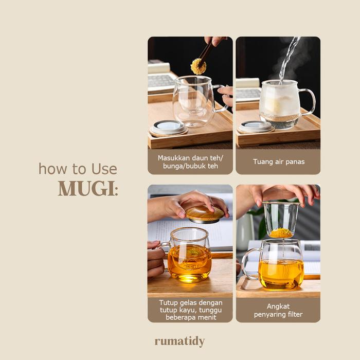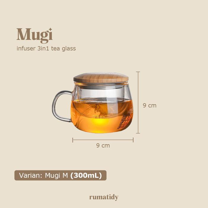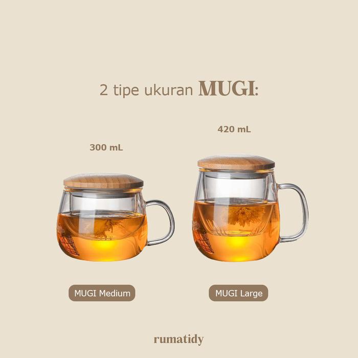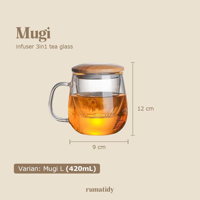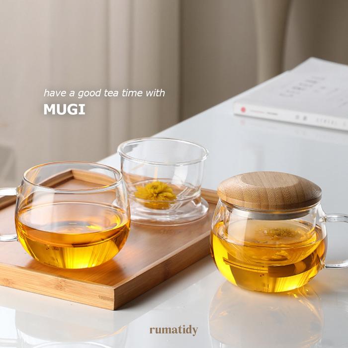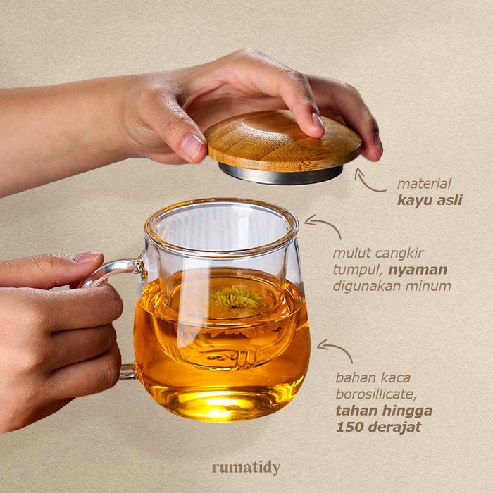 DP 0 MUGI GELAS TEH KACA 3IN1 DENGAN TUTUP BAMBU KAYU DAN SARINGAN 300ML 420ML GAGANG TEA