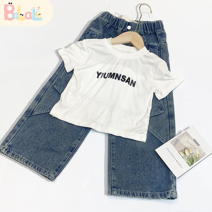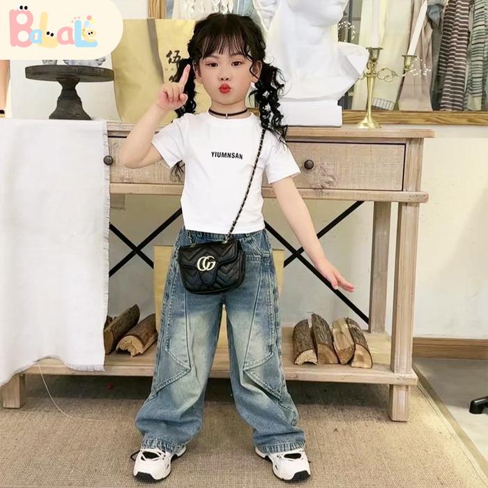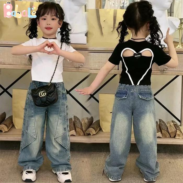 Fashion Anak Perempuan Setelan Anak Perempuan Ootd Anak Perempuan T-Sirt Lengan Pendek+Celana Jeans Cool Kantung Besar
