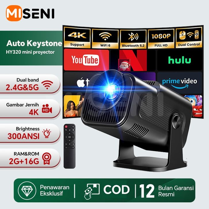 Mini Smart Proyektor Android 13.0 4k full hd 2G RAM+16G ROM Dual Band 2.4g&5g 10000 Lumens WiFi6 1080P MISENI HY320