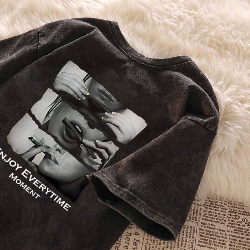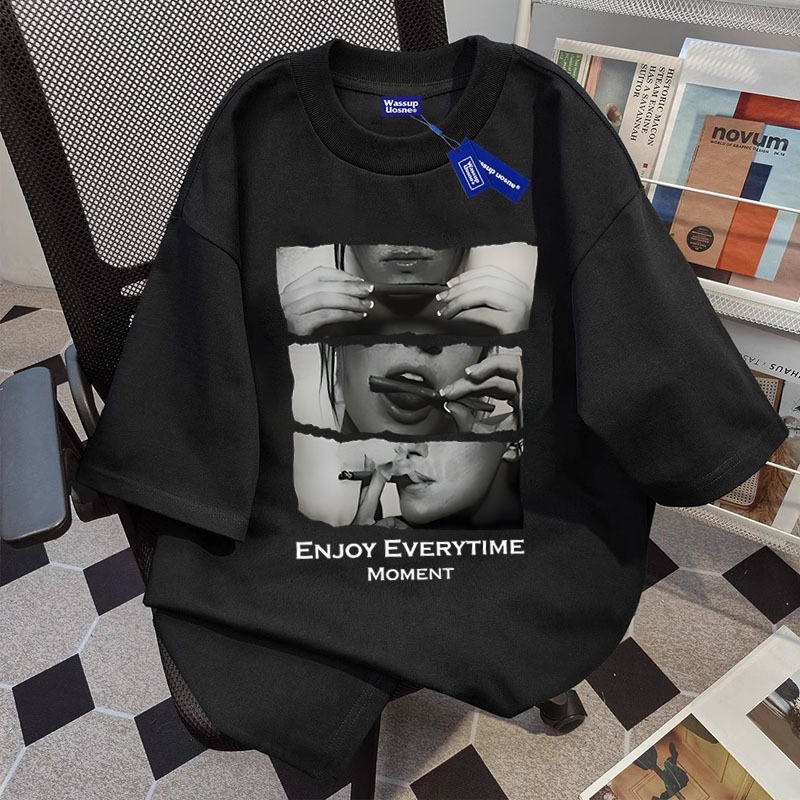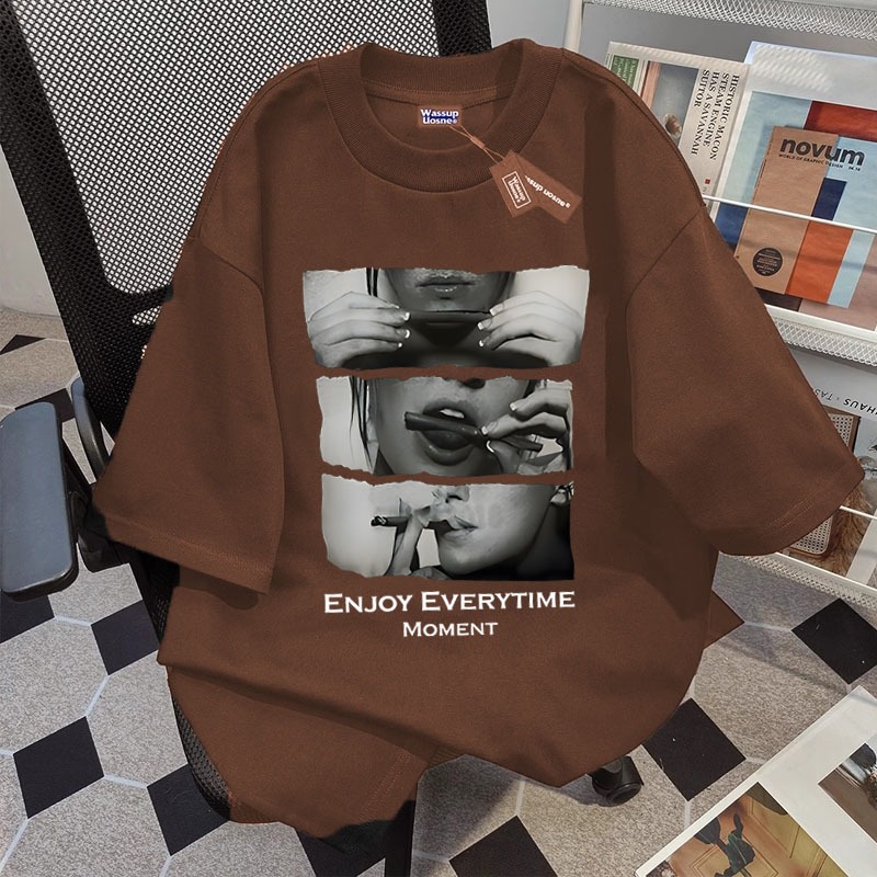 BOOMBAP American retro Style T-shirt Oversize ENJOY EVERYTIME MOMENT Print top| Kaos Wanita cokelat | Kaos pria dan