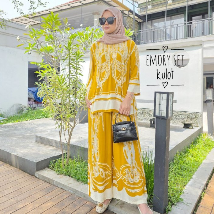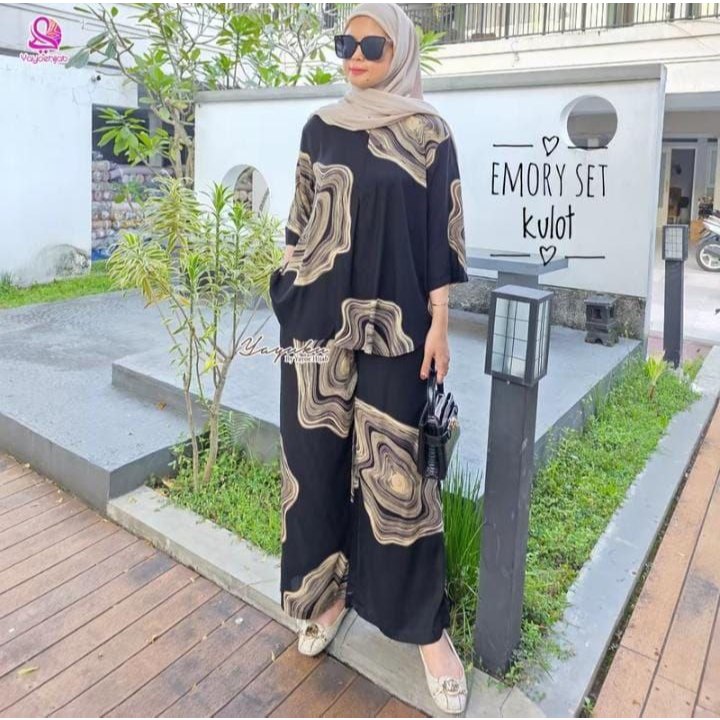 Emory Setelan Celana Kulot Jumbo Rayon Motif Baju Dewasa Wanita OneSet Adem Busui Friendly Yayuku