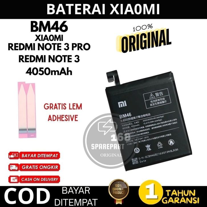 BATERAI BATRE XIAOMI REDMI NOTE 3 / NOTE 3 PRO BM46 4050MAH ORIGINAL BERGARANSI BONUS LEM BATTERY baterai xiaomi