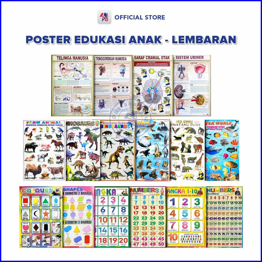 Poster Edukasi Anak Poster Anak Lembaran Water World Binatang Buas Dinosaurus Angka Shapes Tenggorokan Sistem Uriner Pus