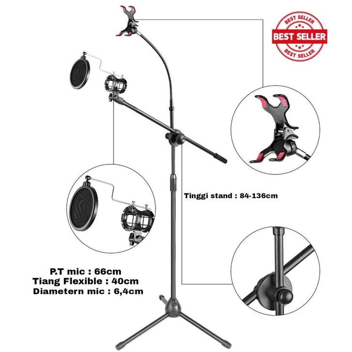 STAND MICROPHONE WITH HOLDER COCOK UNTUK STUDIO MUSIK KONTEN PEMULA TRIP00D MICROPHONE STAND MIC PANJANG HP STAND KARAO
