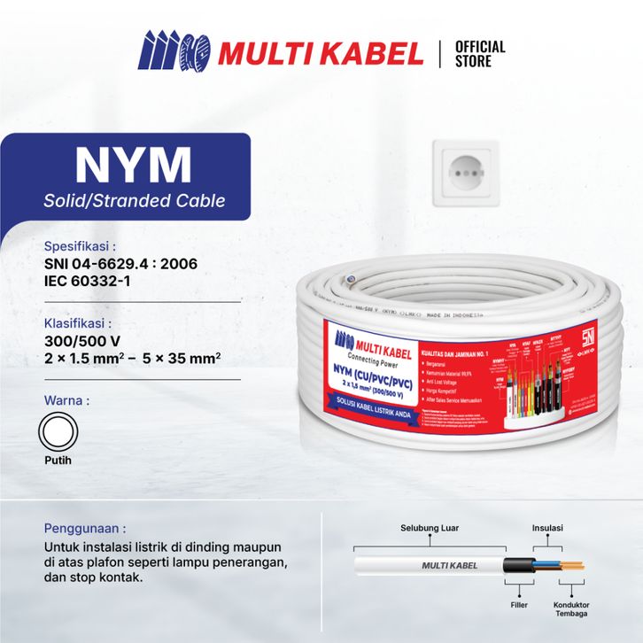 Promo MULTI KABEL-Kabel Listrik NYM 2x1.5 mm - Kabel Tembaga Kawat Murni PVC SNI-Putih-Permeter New
