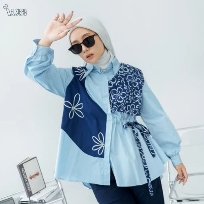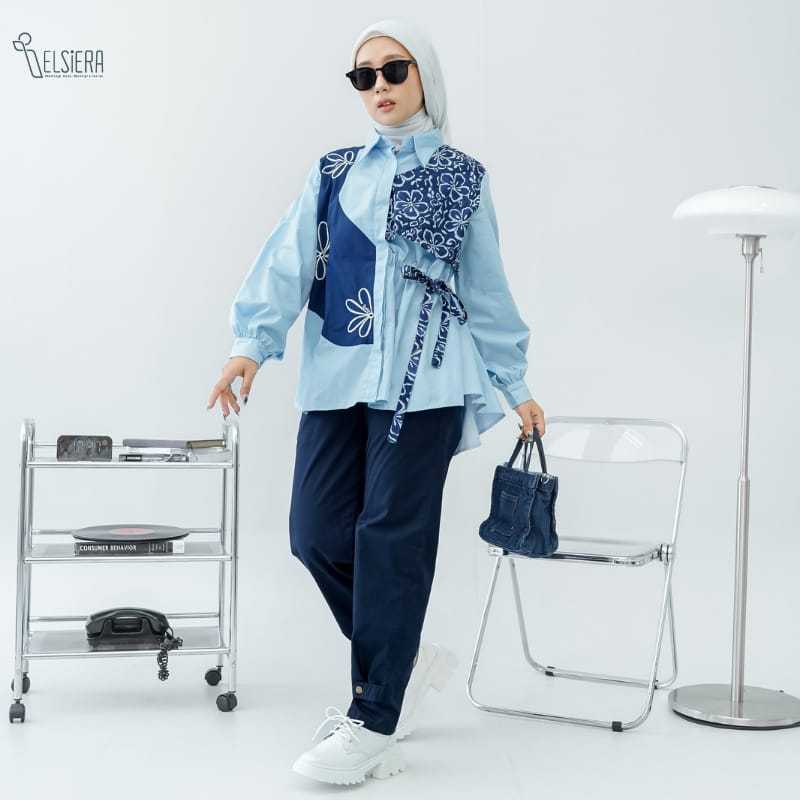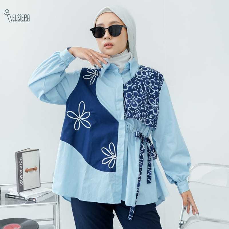 Elsiera Chana Shirt Kemeja Oversize Wanita Motif Asimetris Pita Serut - Blue