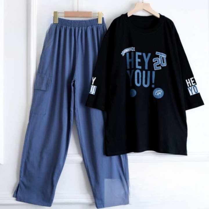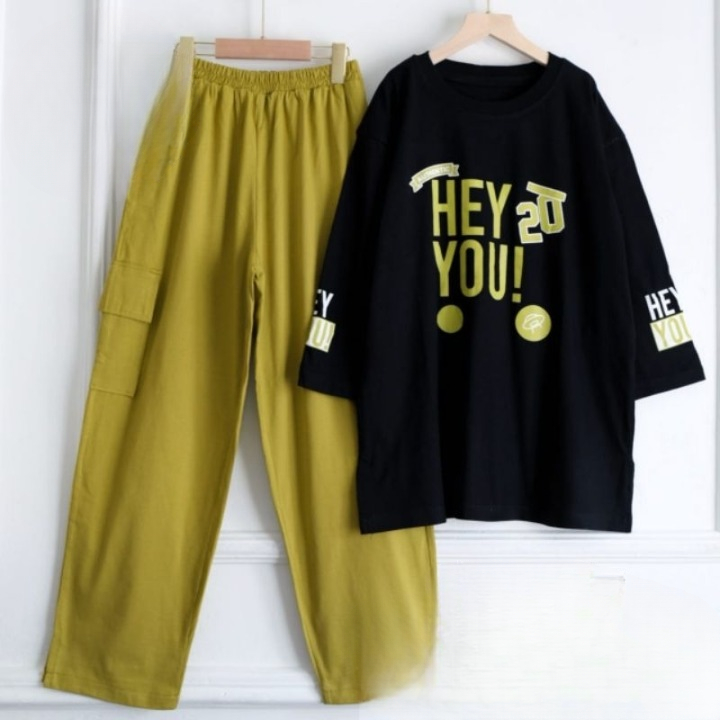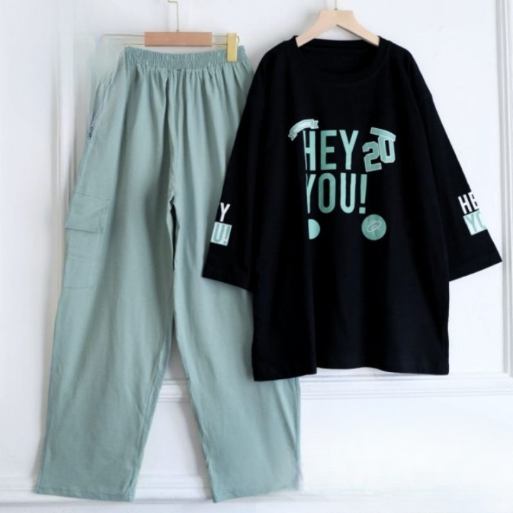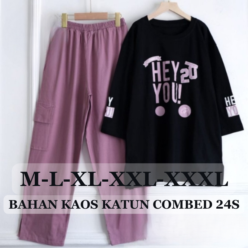 Setelan Cargo Wanita Hello Set BO Size M L XL XXL XXXL LD 100-130 cm Bahan Kaos Katun Combed 24s Aplikasi Sablon Ba
