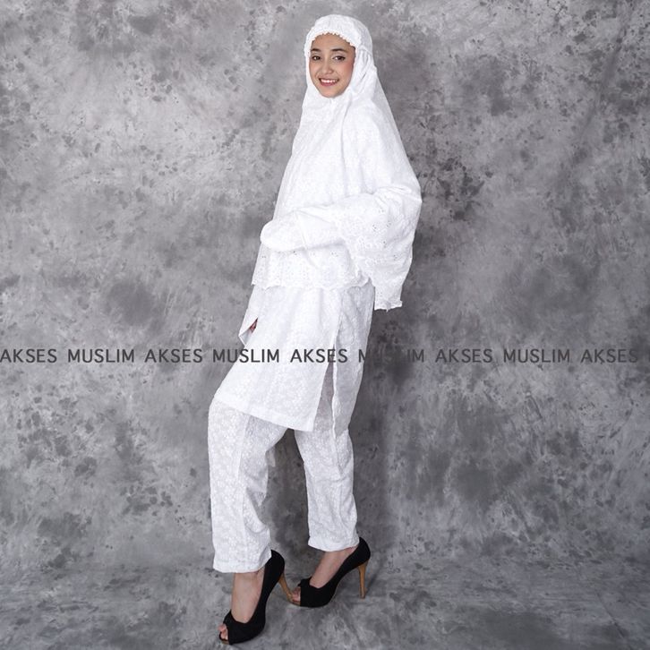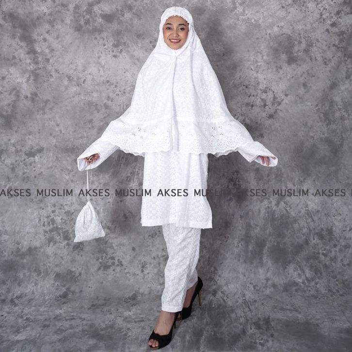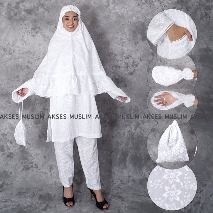 TERBARU Baju Setelan Ihrom Putih Wanita Set Kumplit Renda Kerancang Perlengkan Haji dan Umrah Wanita enars