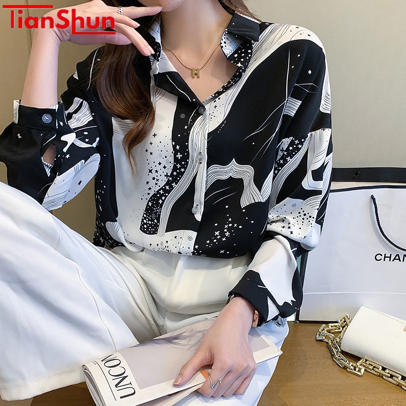 TianShun Popular Soft Fabric Long Sleeved Shirt In Black and White Korean Fashion Casual Work Clothes OL Top for Wo