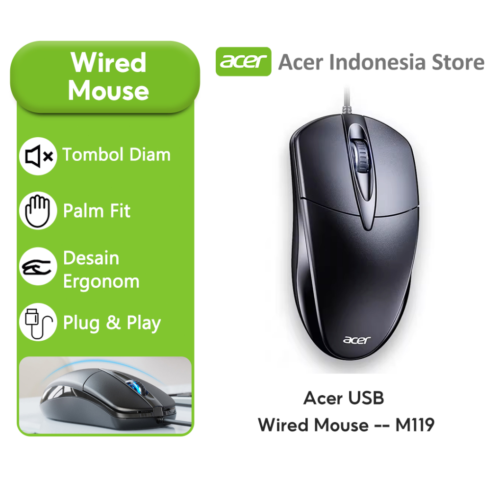 Acer USB Wired Mouse M119 Bass Button 1000DPI Komfortable For Office, Home, Game, Laptop, Desktop